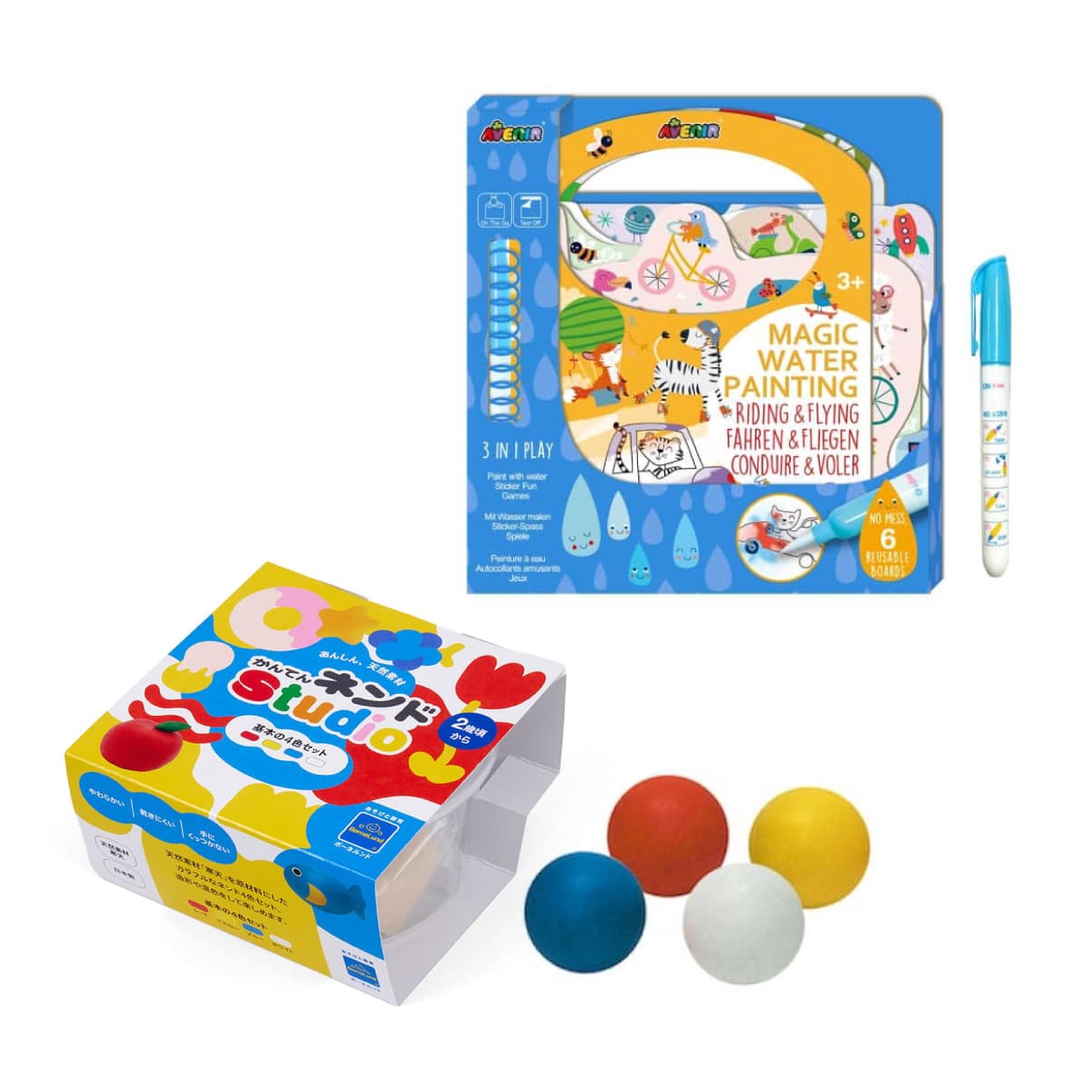 水を入れたペンでお絵描きができるウォーターマジックと、基本の4色が入ったかんてんネンドのセットです。ウォーターマジックは手が汚れないので車や電車の移動中にもぴったり。かんてんネンドは、冷蔵庫で冷やして遊ぶことでいつもと違った感触遊びを楽しめます。