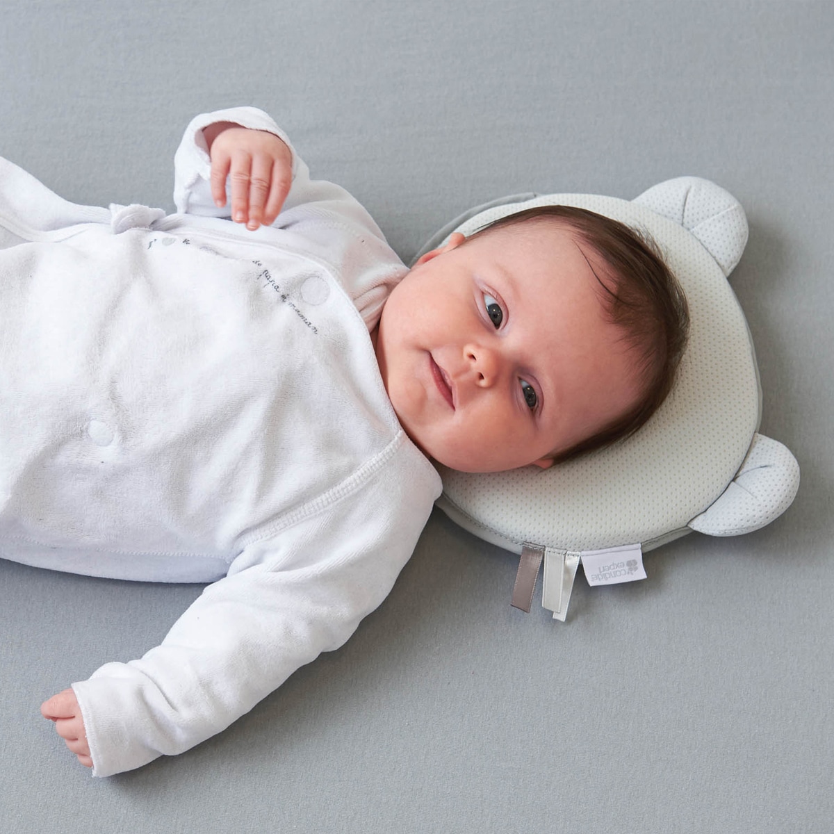 頭蓋骨がやわらかい赤ちゃんの頭をやさしく包む低反発素材。同じ姿勢が続くことでおきる頭の形やゆがみ予防にもなります。 中央のくぼみは通気性のよいメッシュ素材。全体に小さな空気穴があいたパンチング素材で熱や汗がこもりません。