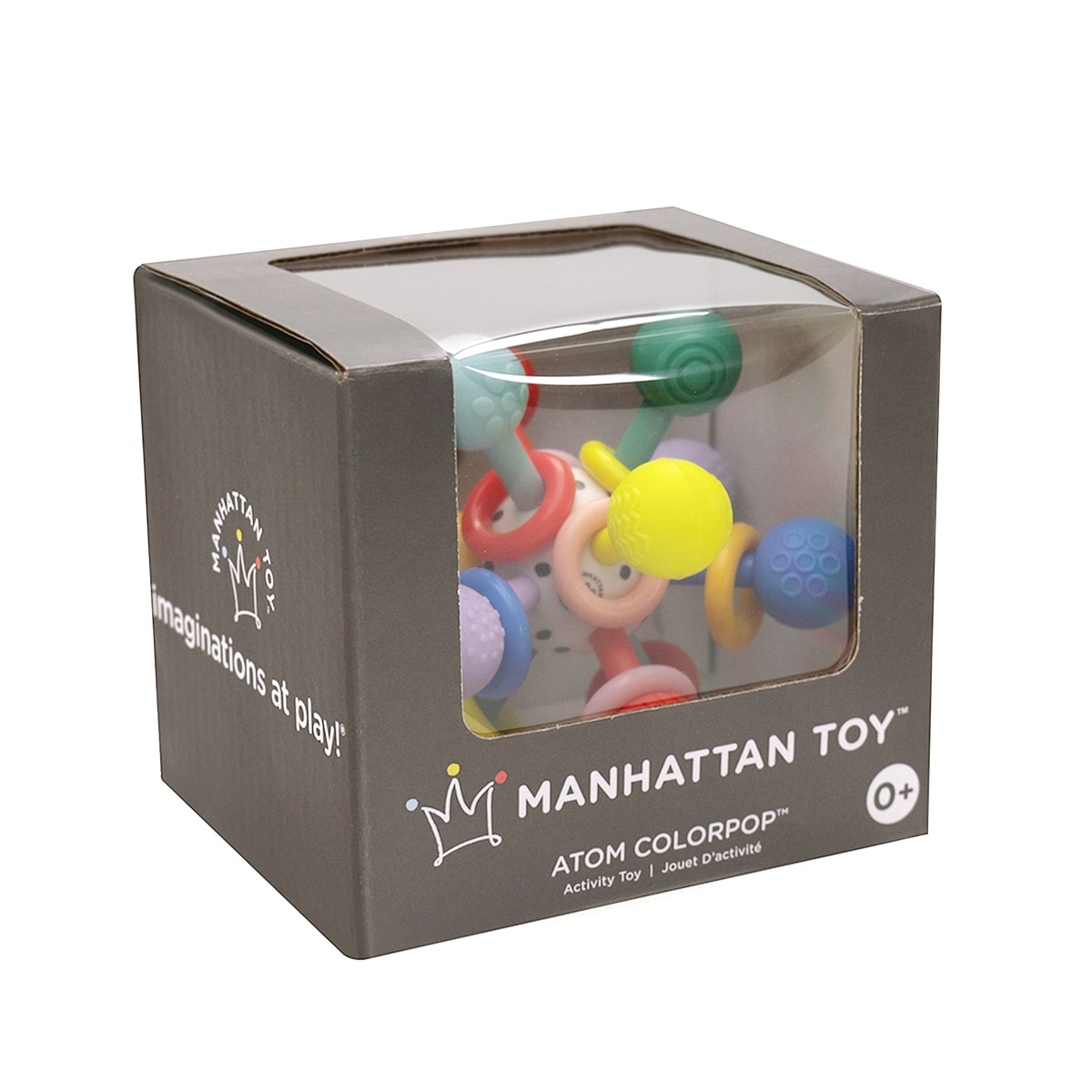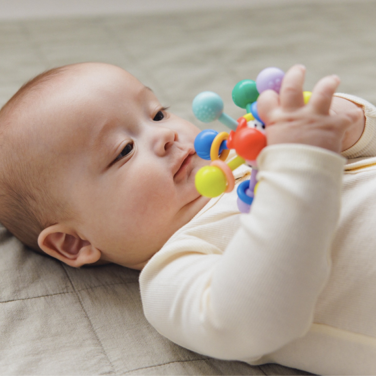 丸いキャンディーのような思わずお口に入れたくなる形状。 中のリングはカラカラと音が鳴りやすい硬めの素材を使っています。 振るとリングがシャラシャラと鳴り、ラトルとしても楽しめます。
