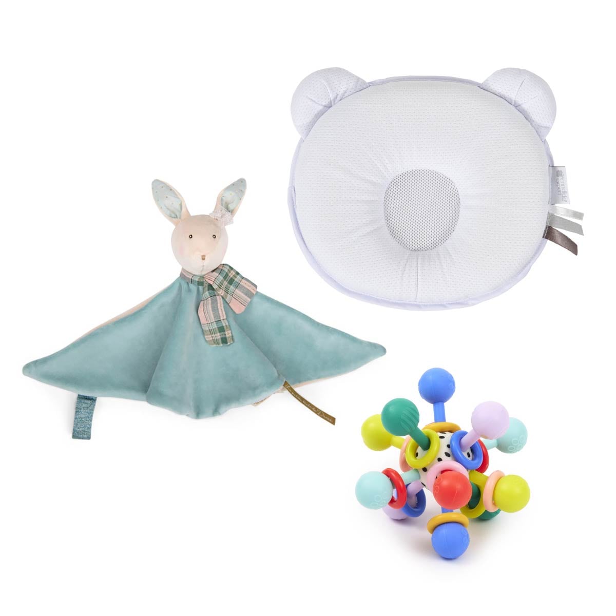 お部屋で過ごすことも多い赤ちゃんの快適な環境づくりにおすすめの道具を集めたセットです。パンダまくらは通気性の良いメッシュ素材で熱や汗がこもりにくく、赤ちゃんの快適な眠りをサポート。ラトルキャンディーや肌ざわりの良いおしゃぶりタオルは赤ちゃんの眠りやお出かけにも重宝するお守りアイテムです。