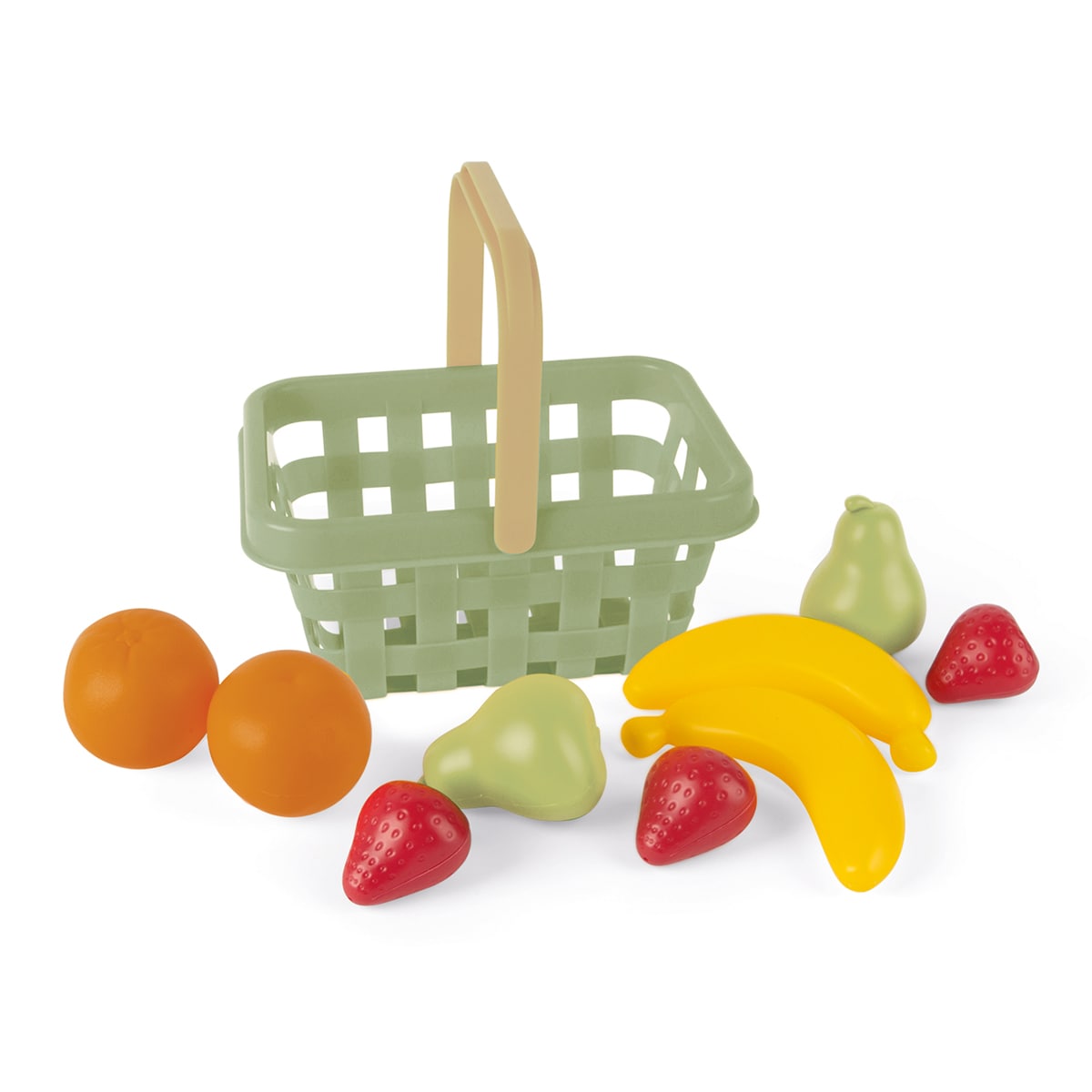 「お買い物カゴ」にフルーツ4種が入ったセット。地厚なポリエチレン製で、ぎゅっと握ってもへこみにくいのが特徴です。