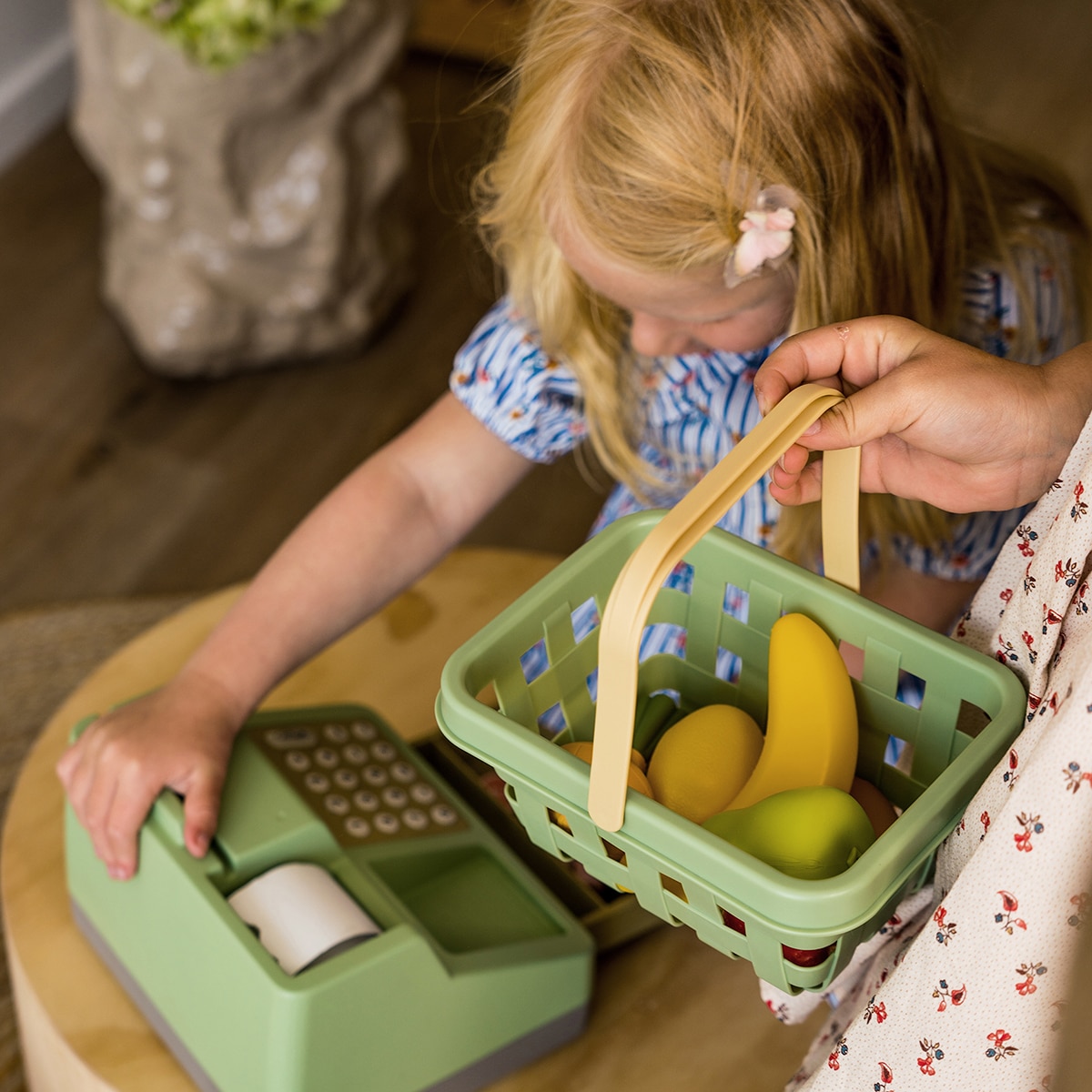 「これください!」「いらっしゃいませ〜」いつもお買い物で見ている大人のやりとりをマネしながら、お店屋さんごっこが広がるセット。最近は少なくなってきているお金のやりとりもあそびの中で体験できます。
