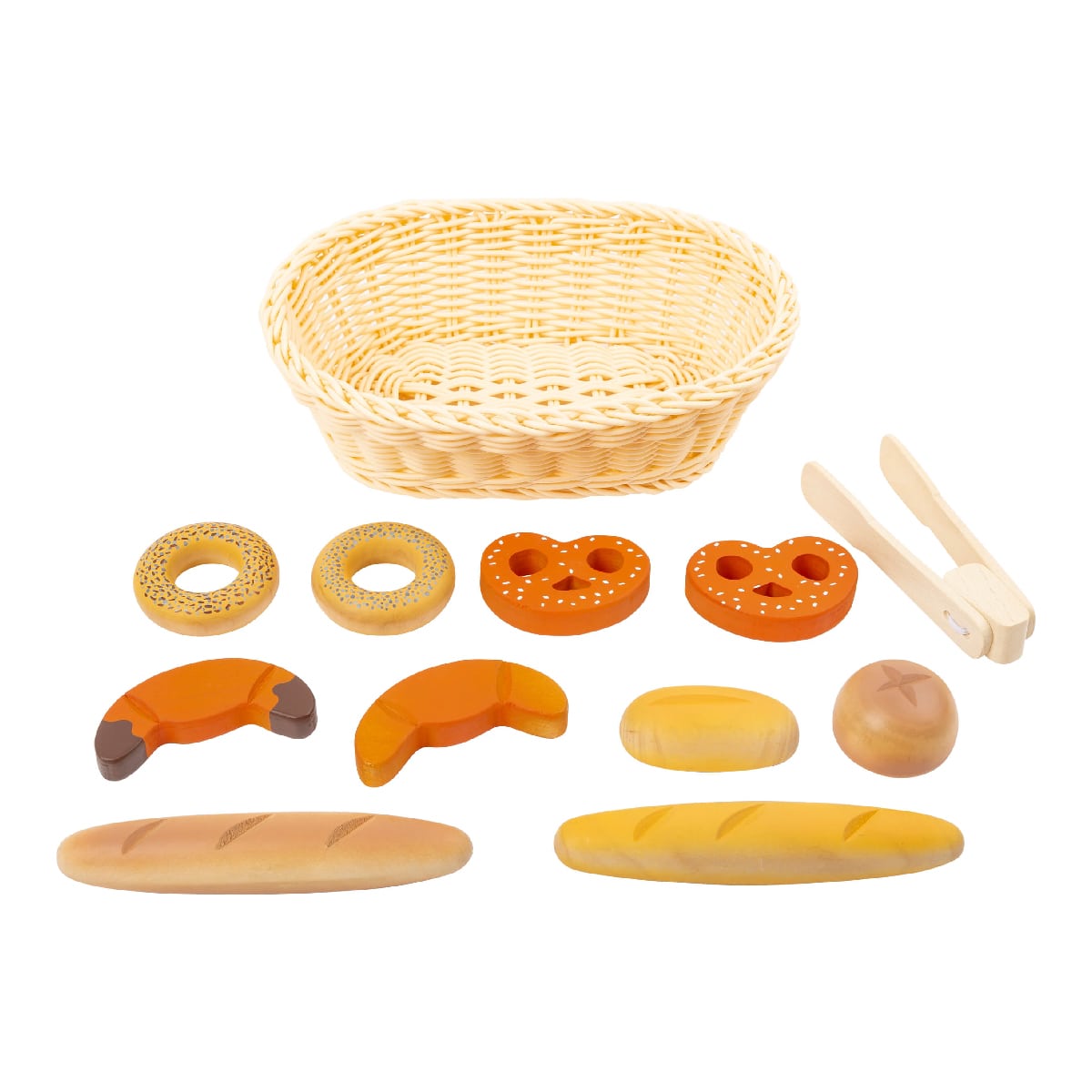 7種類10個のパンとトング、バスケットのセット。パンの中からトングを使って好きなパンを選び、バスケットに入れてお買い物ごっこが楽しめます。