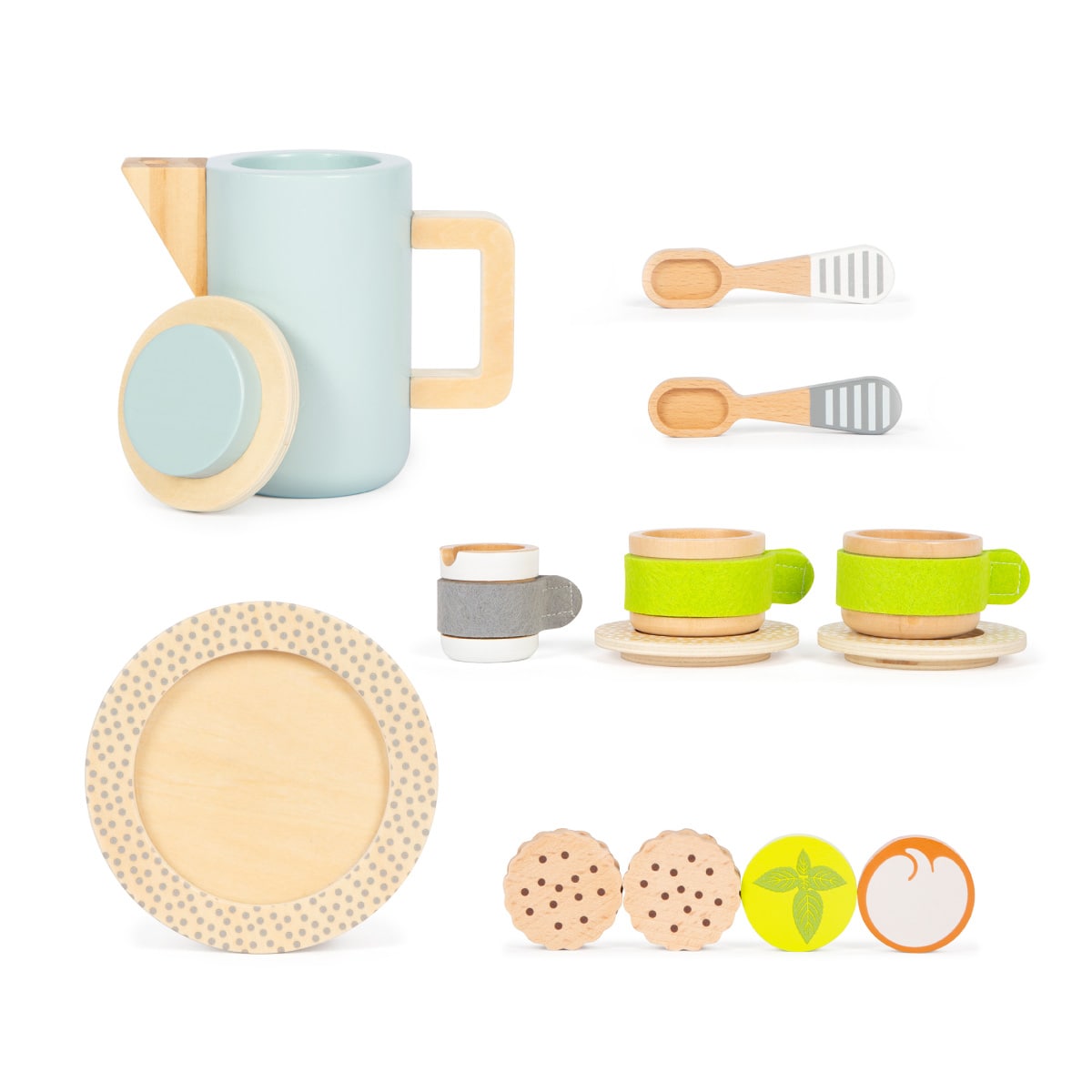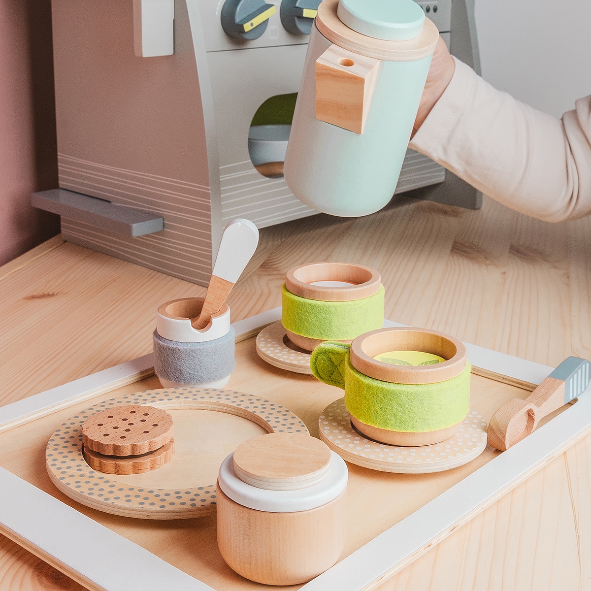 美味しそうなパンの注文を聞いたり、トレーで運んだり、飲み物のおかわりを注いだりと、カフェの店員さんごっこが広がるセット。本物そっくりなので「ママやパパ、お店屋さんと同じようにできた!」という満足感と、コミニュケーション能力や社会性を育みます。 木製の一部にフェルトを取り入れたユニセックスなデザインのティーセット。大好きなおやつの時間を再現できます。