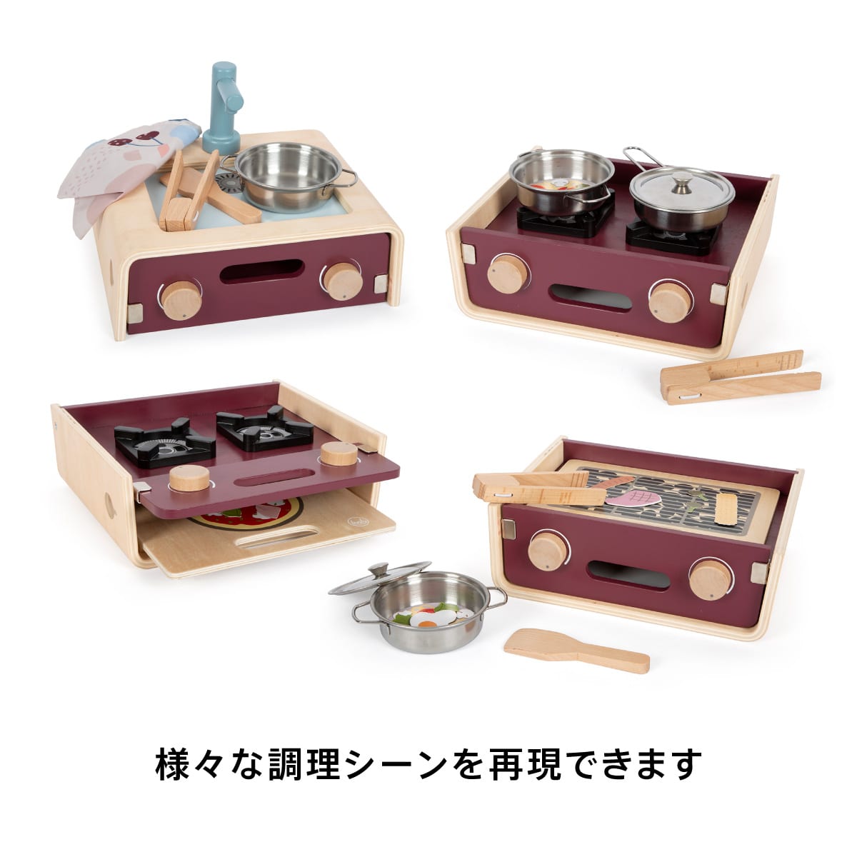 落ち着いたデザインのマルチな機能の卓上キッチンです。コンパクトで場所を選ばず、テーブルの上でも手軽にあそべます。