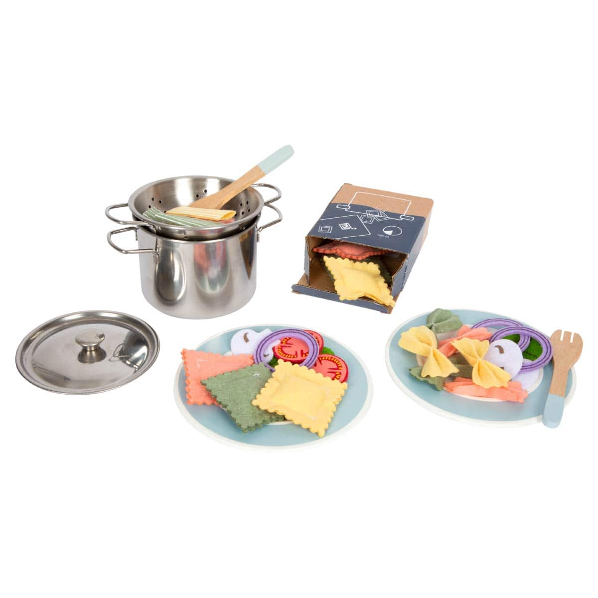 なべ・湯切りざる・フォークなどの調理器具と3種のショートパスタやトマト・玉ねぎなどの食べものがすべてセットになっています。