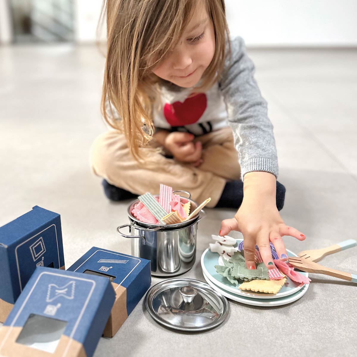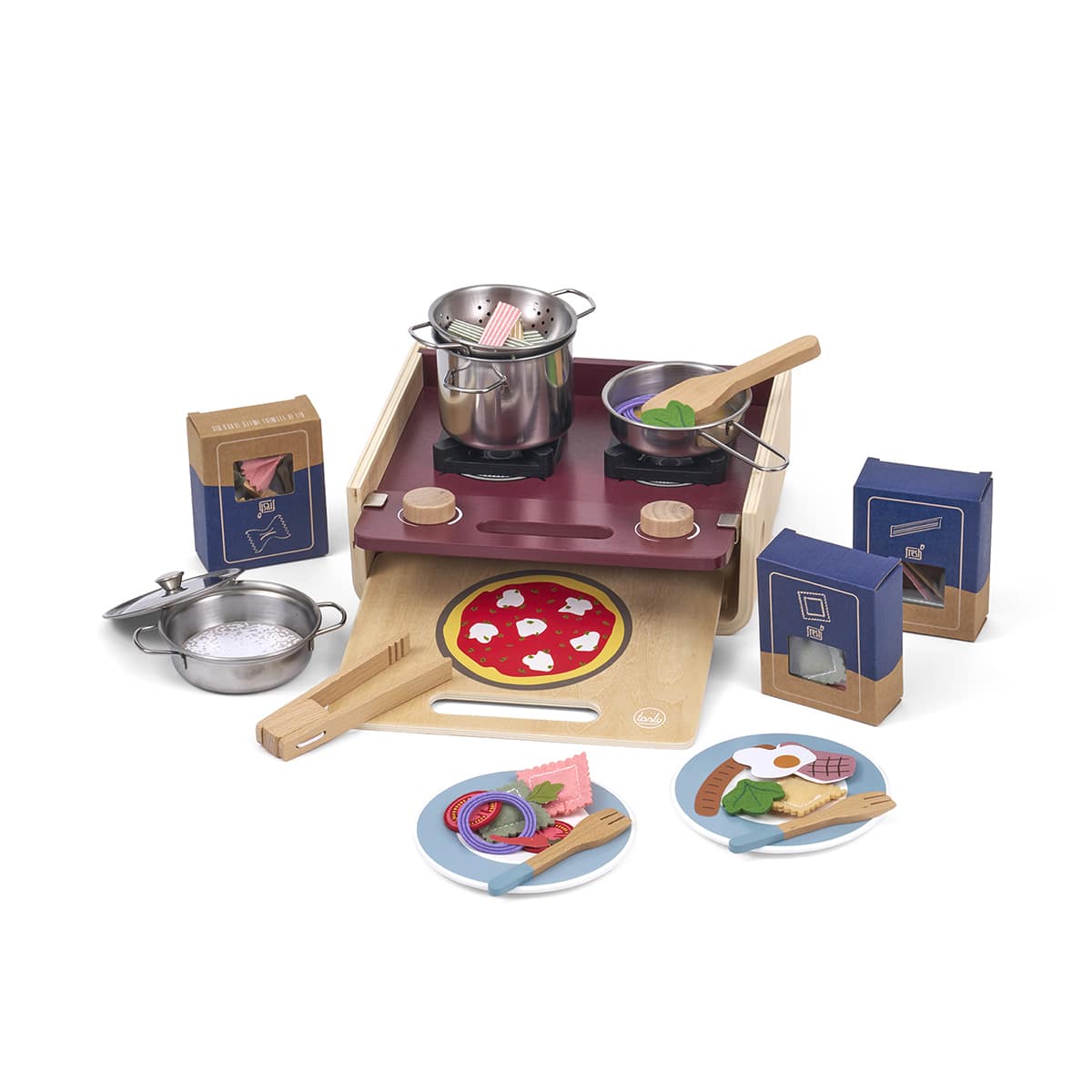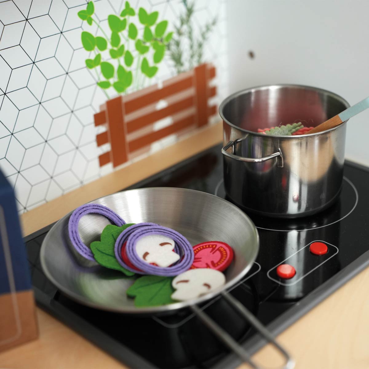 本格的なイタリアンシェフ気分が味わえるセット。キッチンはコンパクトな卓上タイプだから、好きな場所で手軽におままごとが楽しめます。ステンレス製のお鍋でパスタを茹で、グリルでピザを焼けば、一流シェフの仲間入りです。