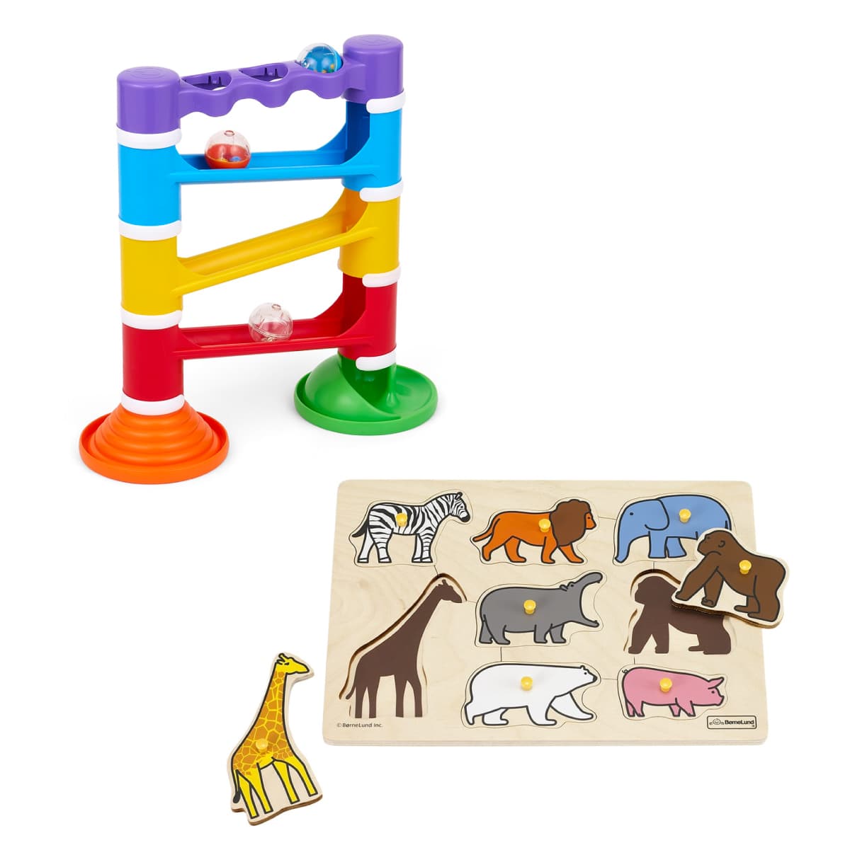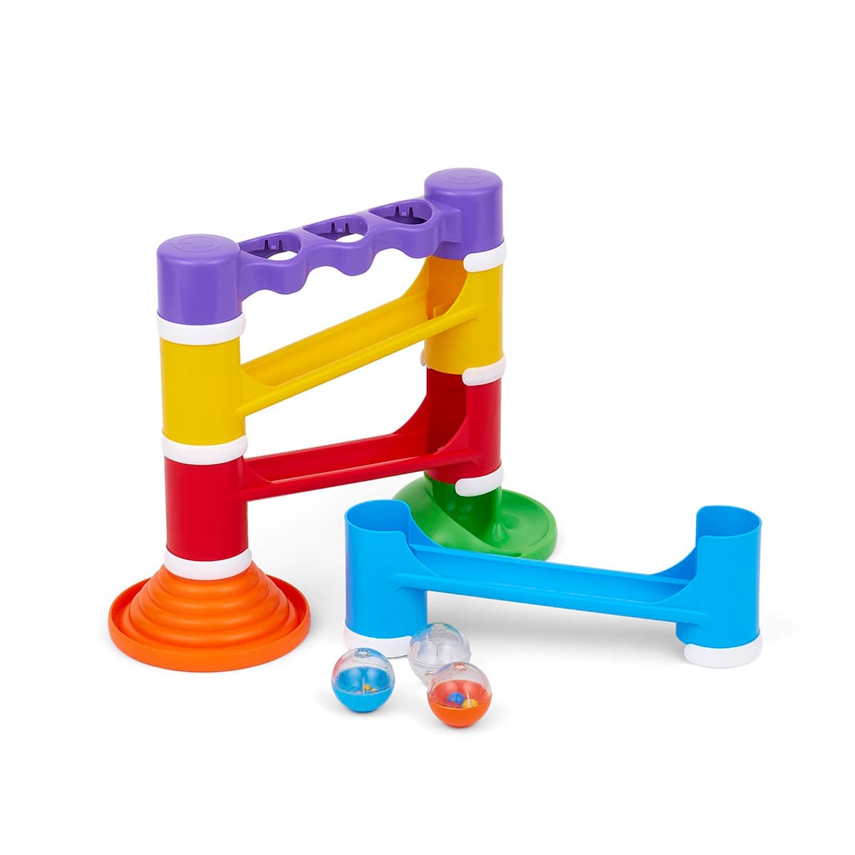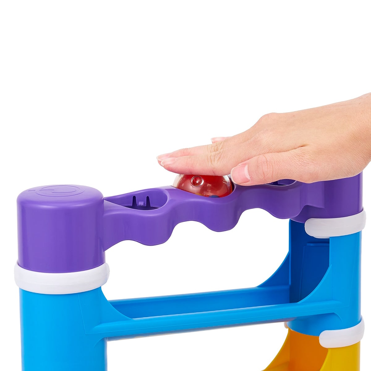 目的をもって手を動かすことが楽しくなる1歳半頃は、ボールをポンッと叩くだけですぐに転がるという結果が得られる遊びが楽しくなる時期。転がるときに音や色が変化し、何度も遊びたくなるザインです。