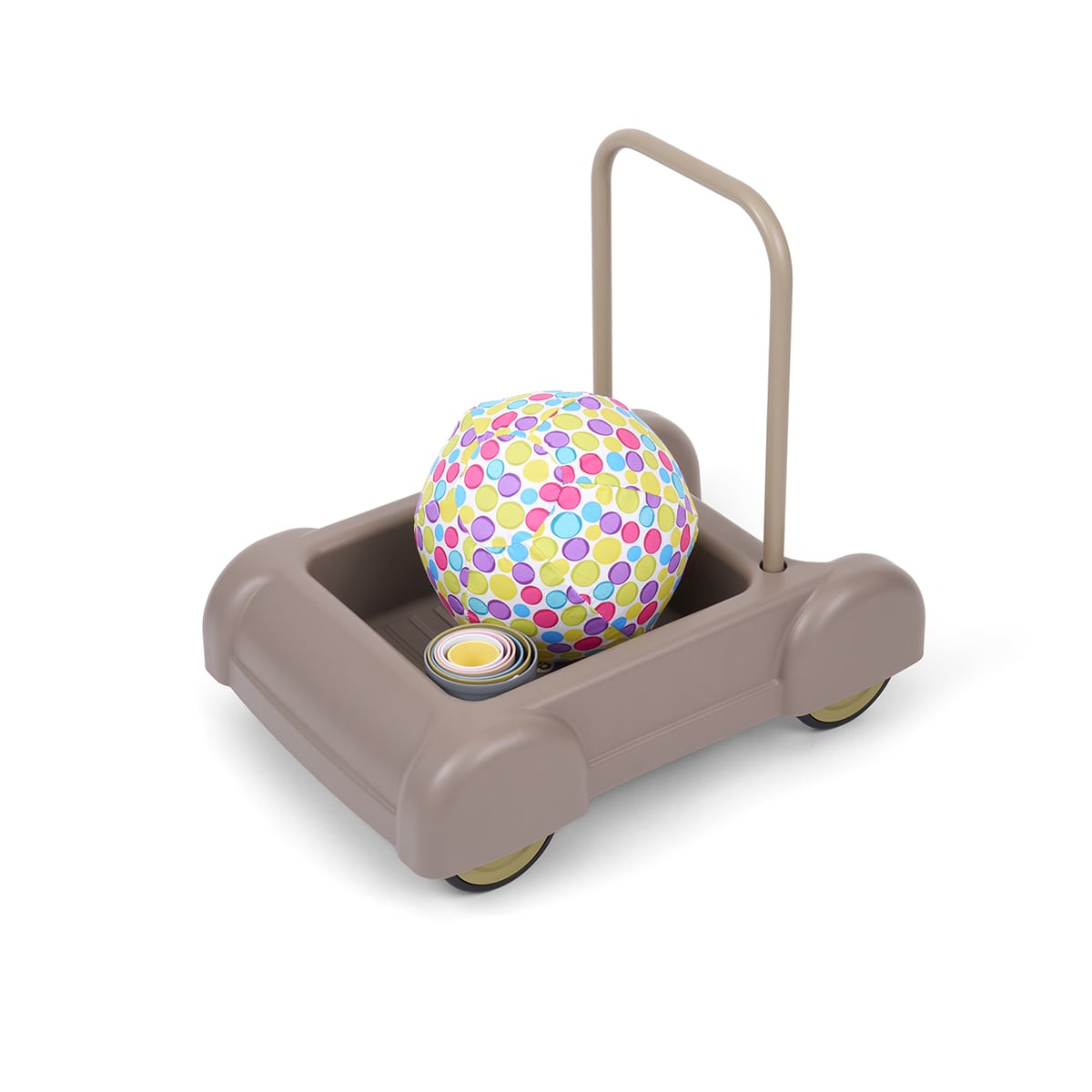 視野と興味が広がり、おうちの中でも活動範囲が広がる頃にぴったり。安定感のある大きな車輪が歩行をサポートします。安心できる支えがあることで、自然と長い時間あんよの練習が出来たり、バランスを取りながら姿勢を保ったり、方向をコントロールしたりといった、粗大運動の発達に役立ちます。お気に入りのボールやあそび道具を入れたら、お散歩気分であそべます。