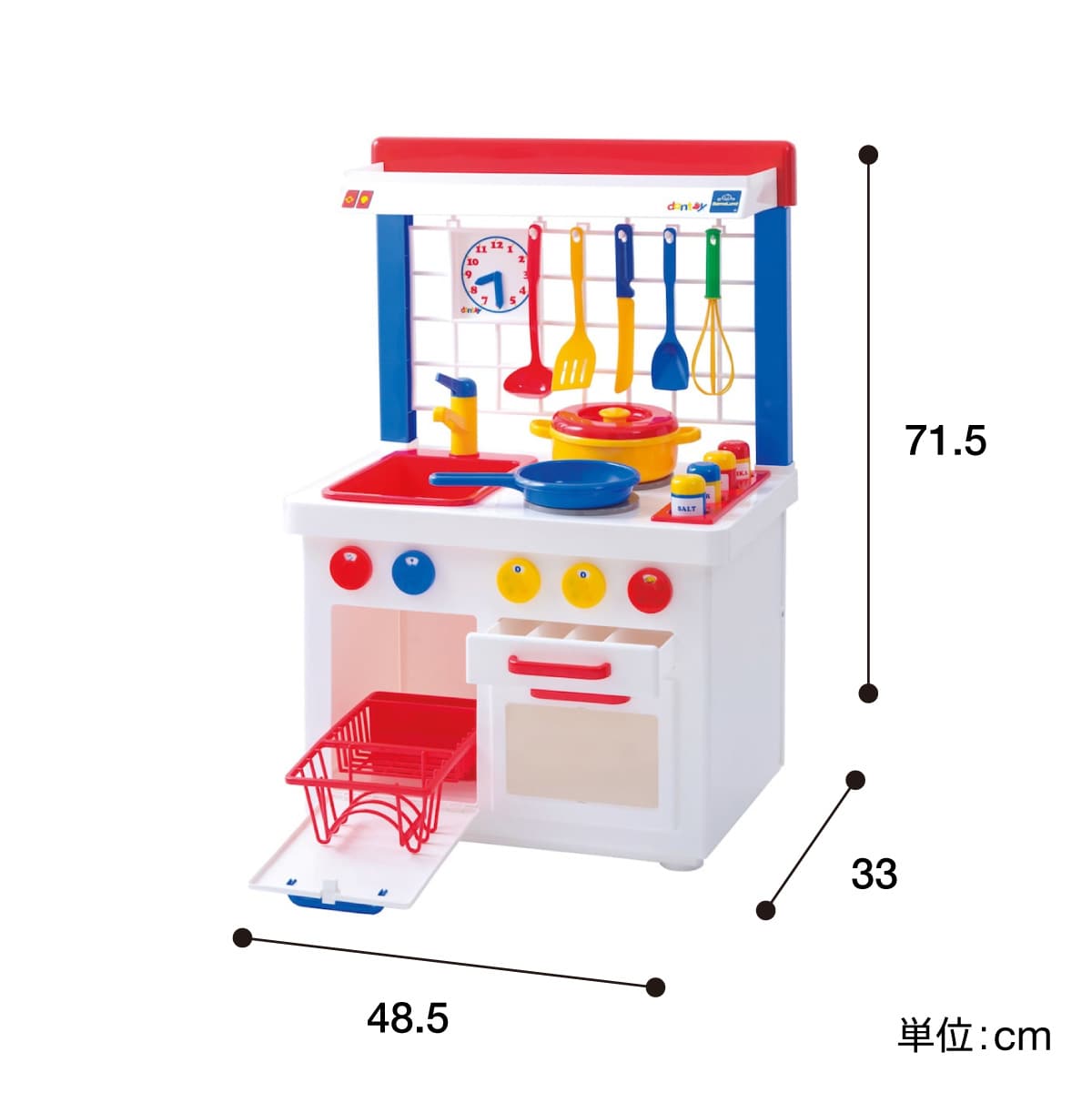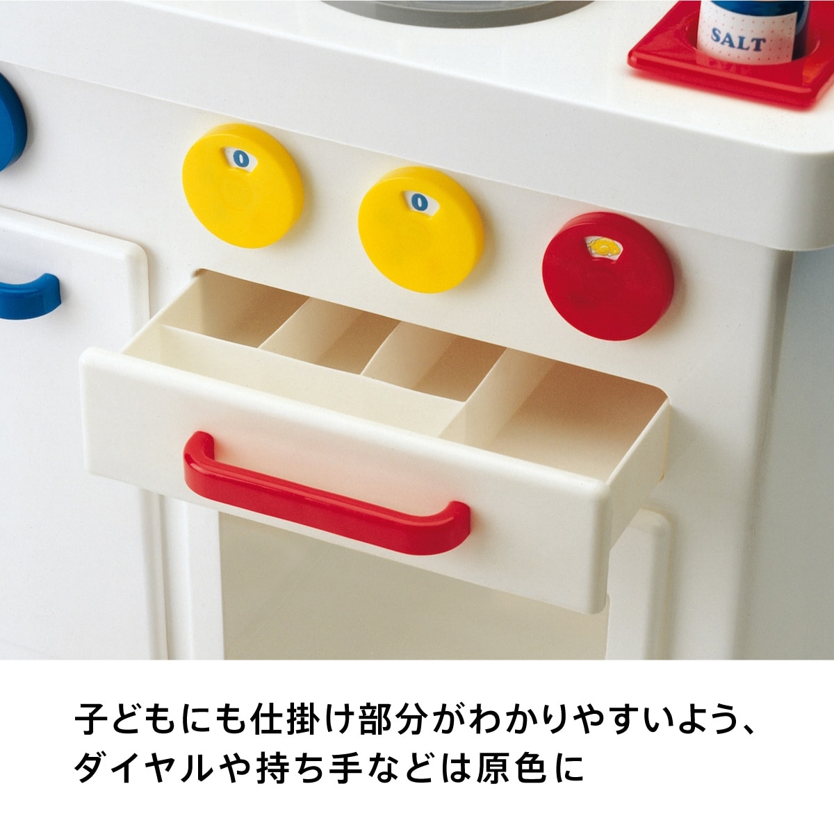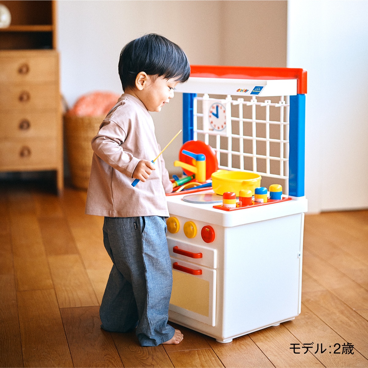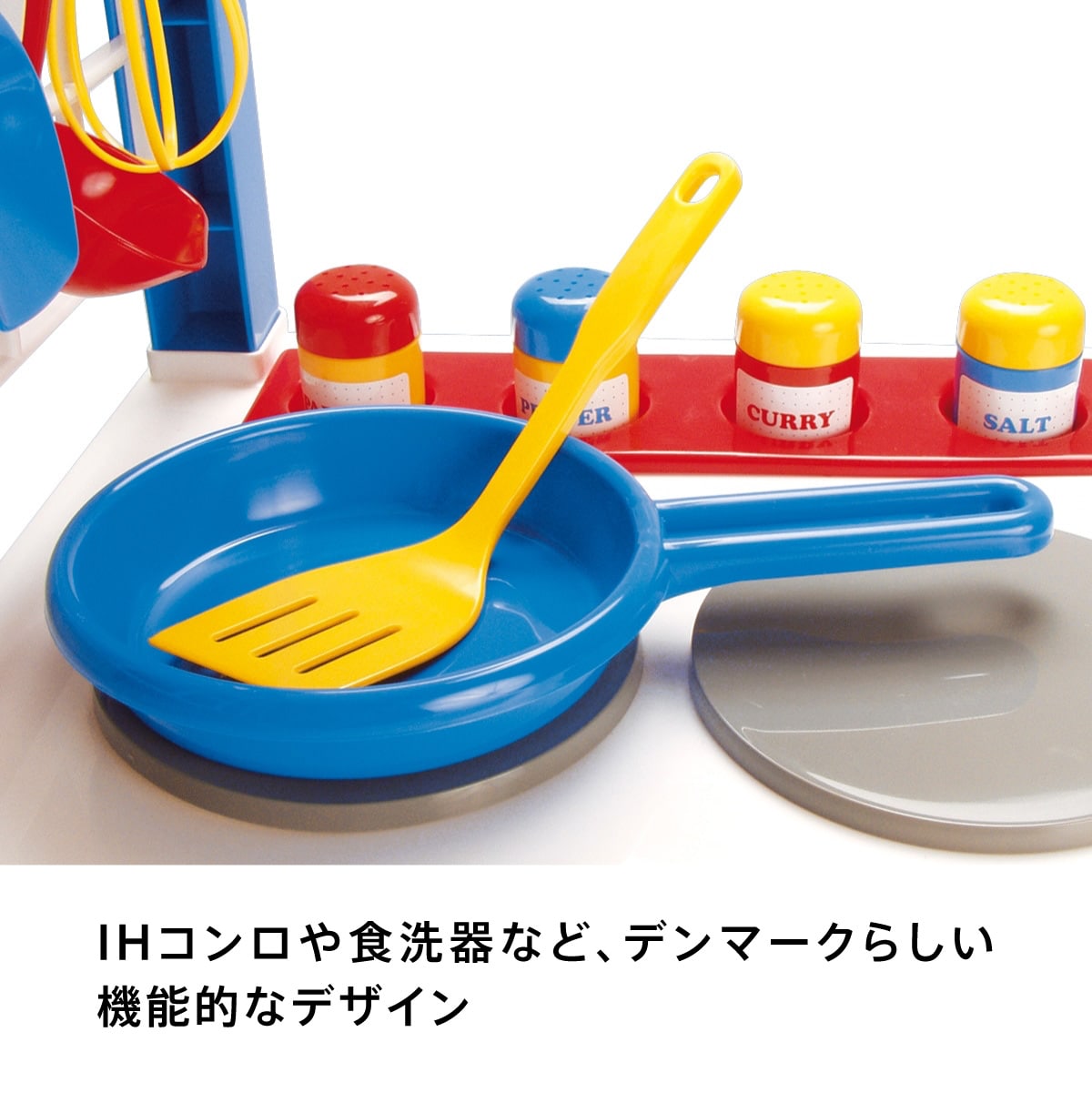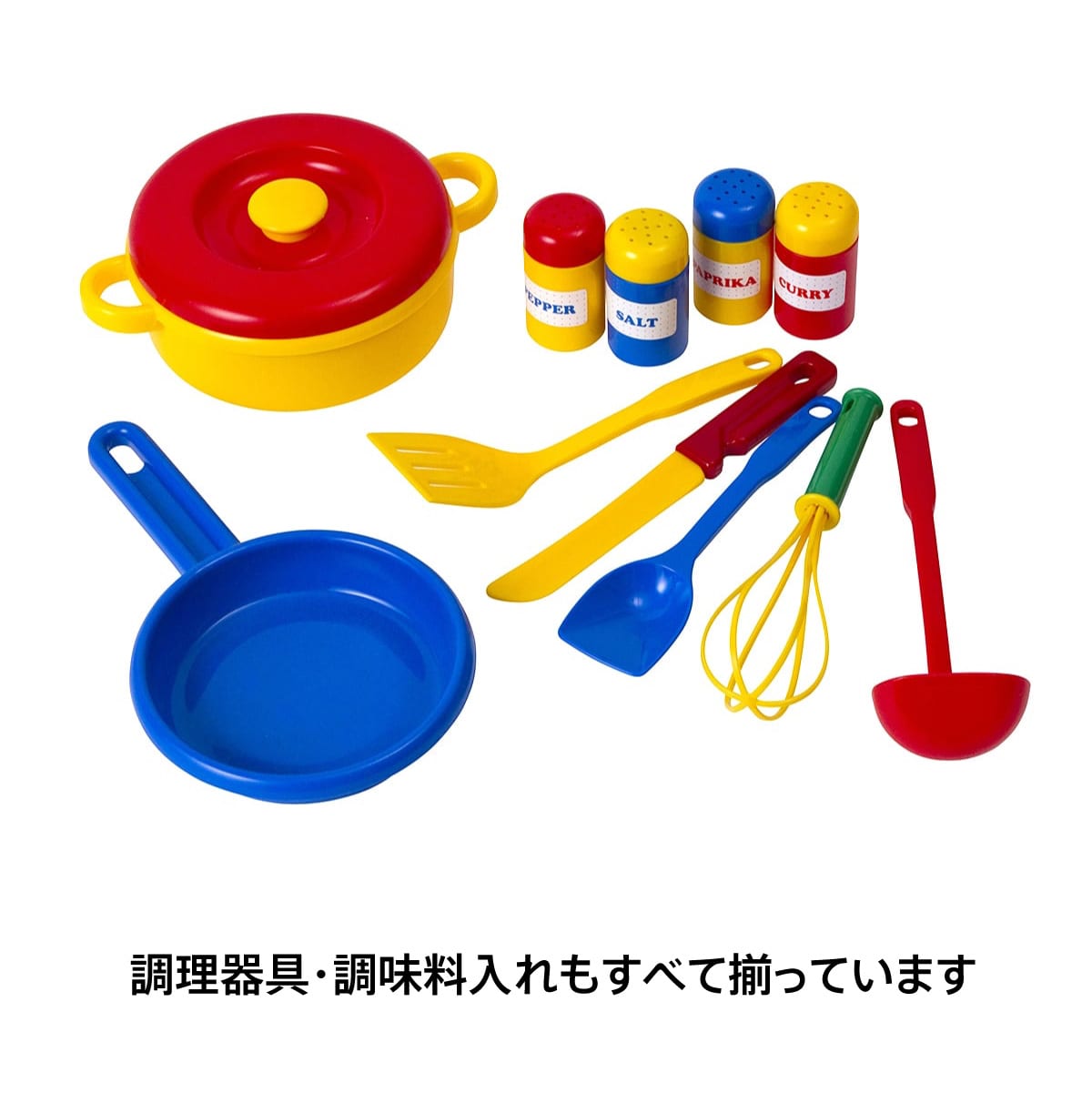 2歳ごろの子どもが等身大で使うことができるサイズ。お料理に必要なフライパン、お鍋、調理器具、調味料入れなどはセットです。
