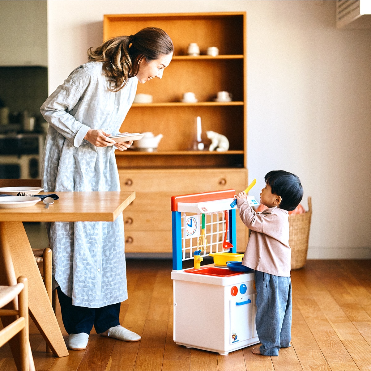 ごっこ遊びのはじまりは成長のシグナルです。遊びながらお料理やお片付けなど、生活の疑似体験を通して日常生活への興味や生活習慣を育みます。お母さんやお父さん、お友だち、コックさんと色々な役を演じながら、役割意識や協調性、コミュニケーション力、他者への思いやりの心も育ちます。子どもの成長には欠かせないあそびの一つで、長く遊べるボーネルンドの代表的なあそび道具です。