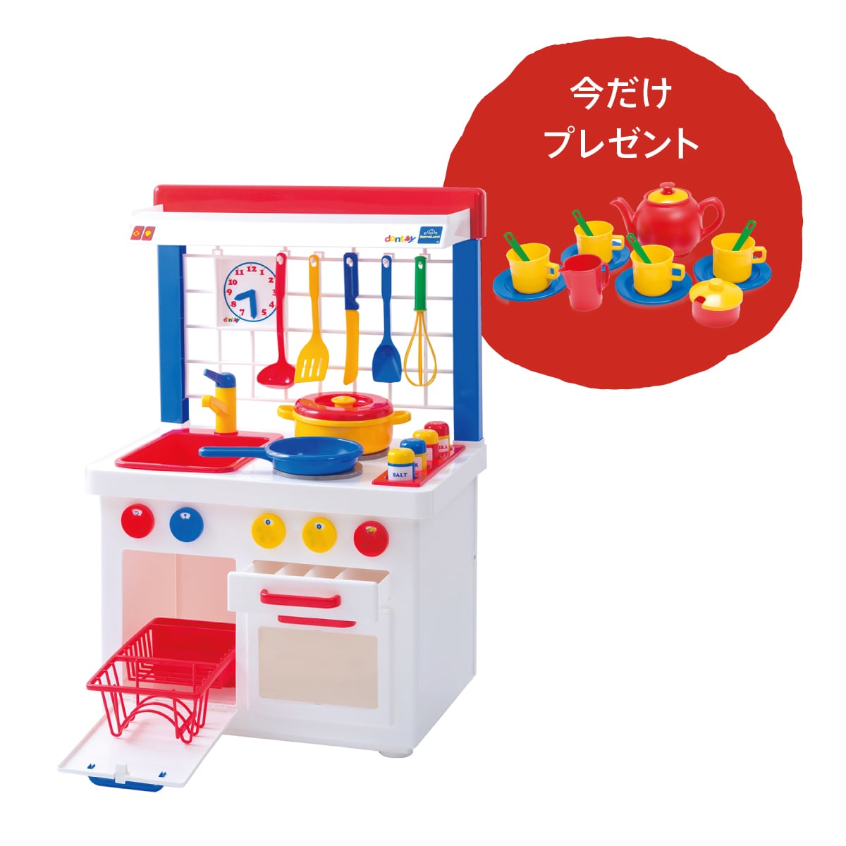 | セット内容 | キッチンセンター本体/シンク×1個/両手鍋(フタ付き)×1個/フライパン×1個/食洗器のかご×1個/コンロ板×2枚/ダイヤル×5個/引き出し持ち手×3個/シールシート×1枚/おたま×1個/ヘラ×1個/フライ返し×1個/泡立て器×1個/包丁×1個/調味料入れ×4個、限定ノベルティ(ティーセット)×1 |