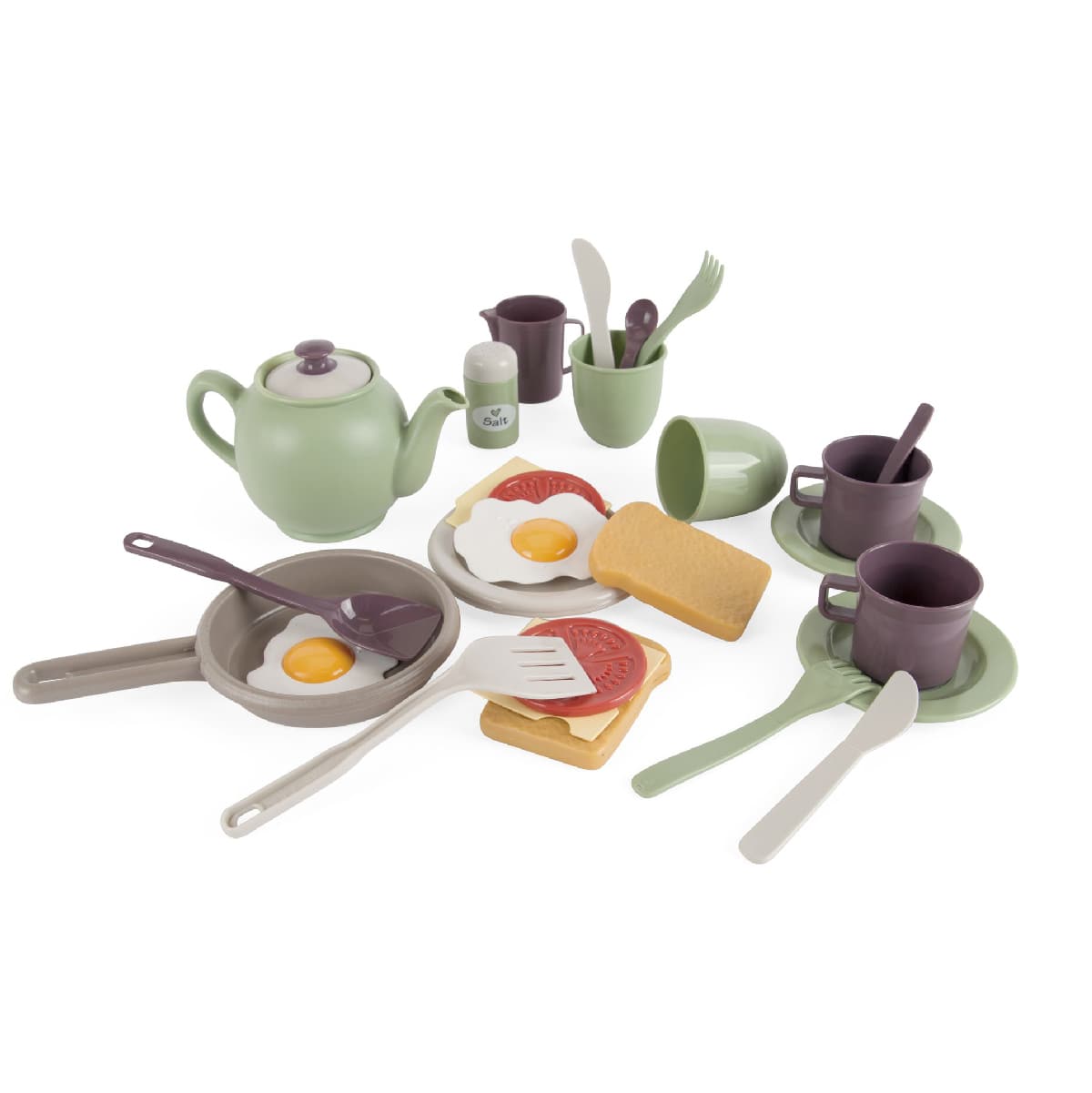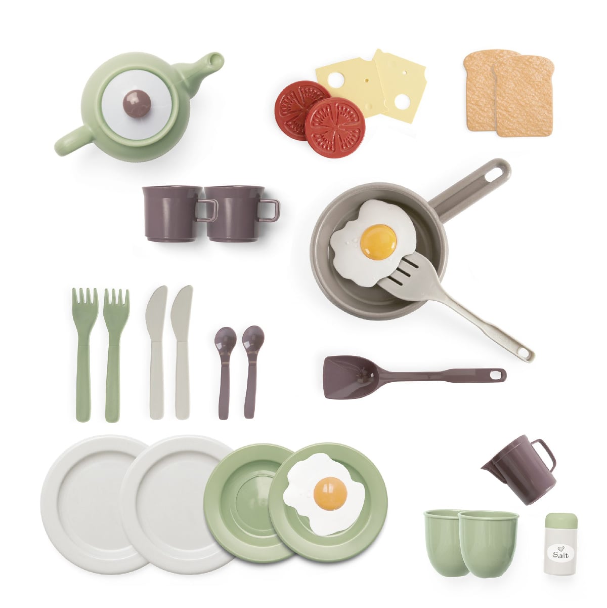 フライパン・ポット・フォークなどの調理器具、目玉焼きやトーストと食べ物がすべてセット。みんなで楽しむのにちょうどいい2人分のセットです。