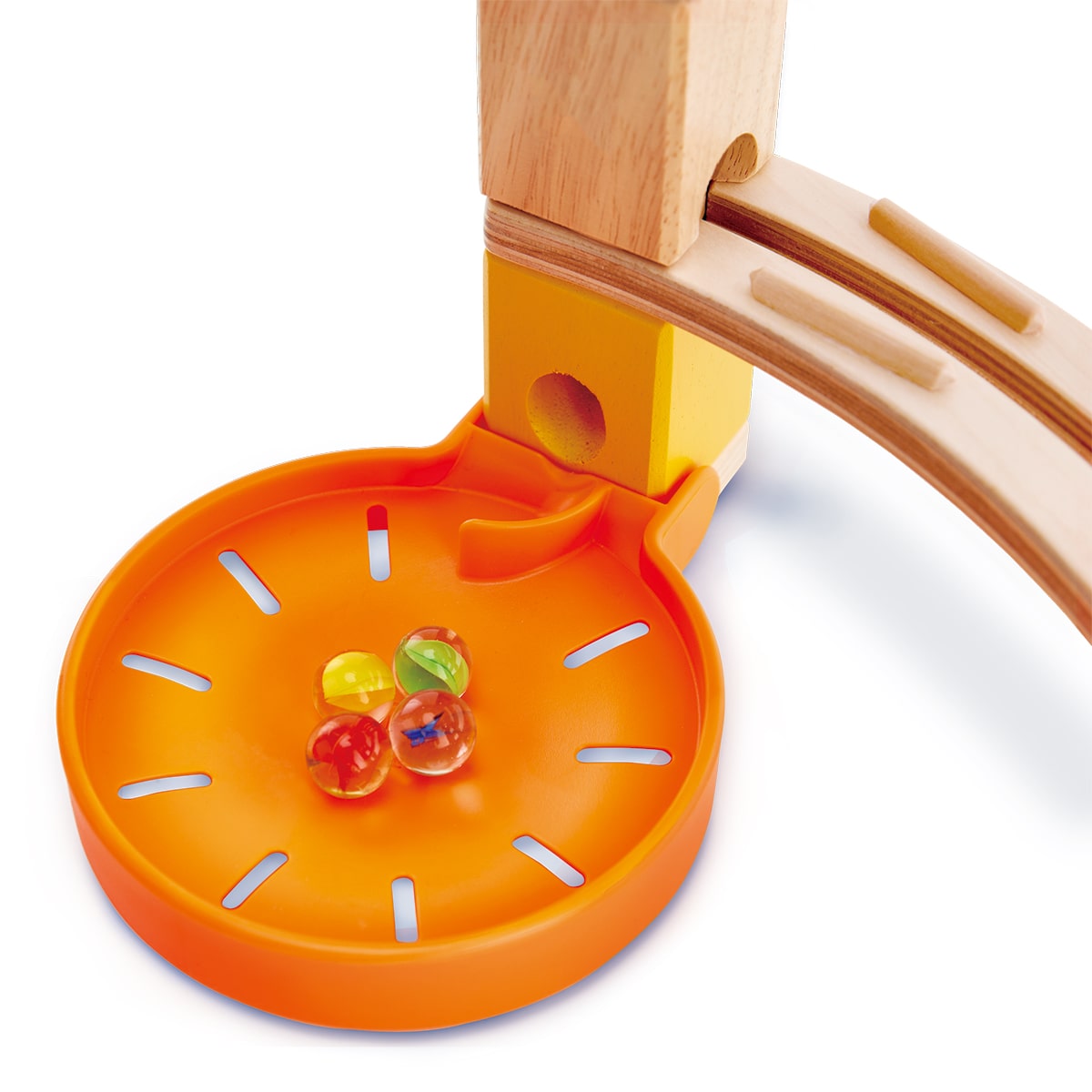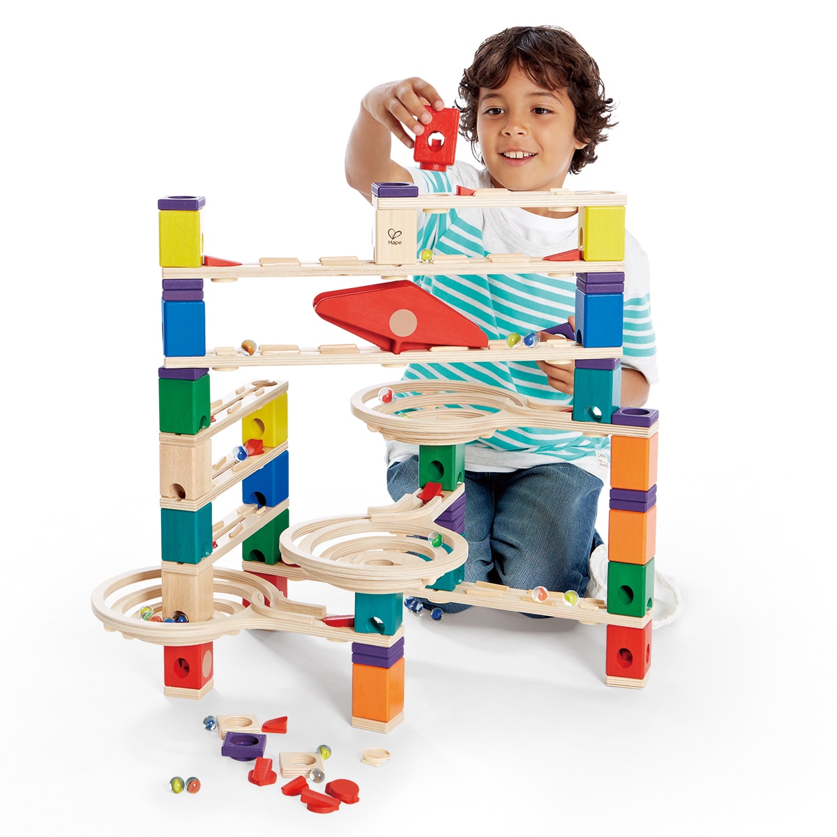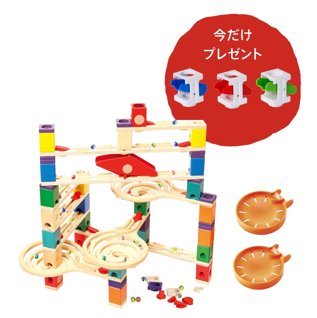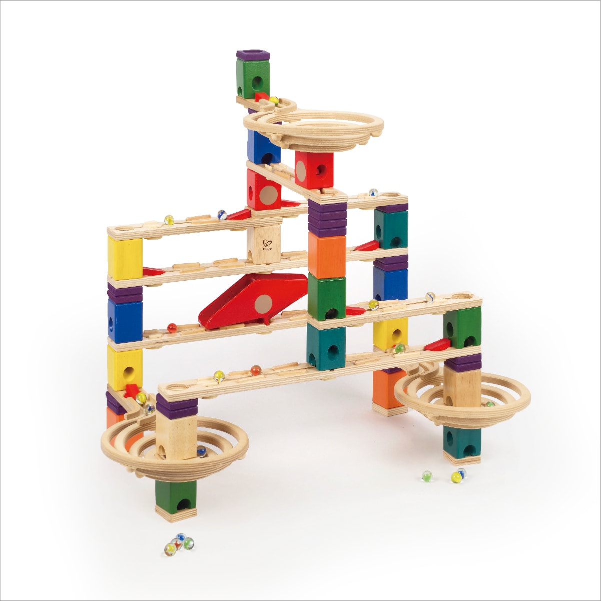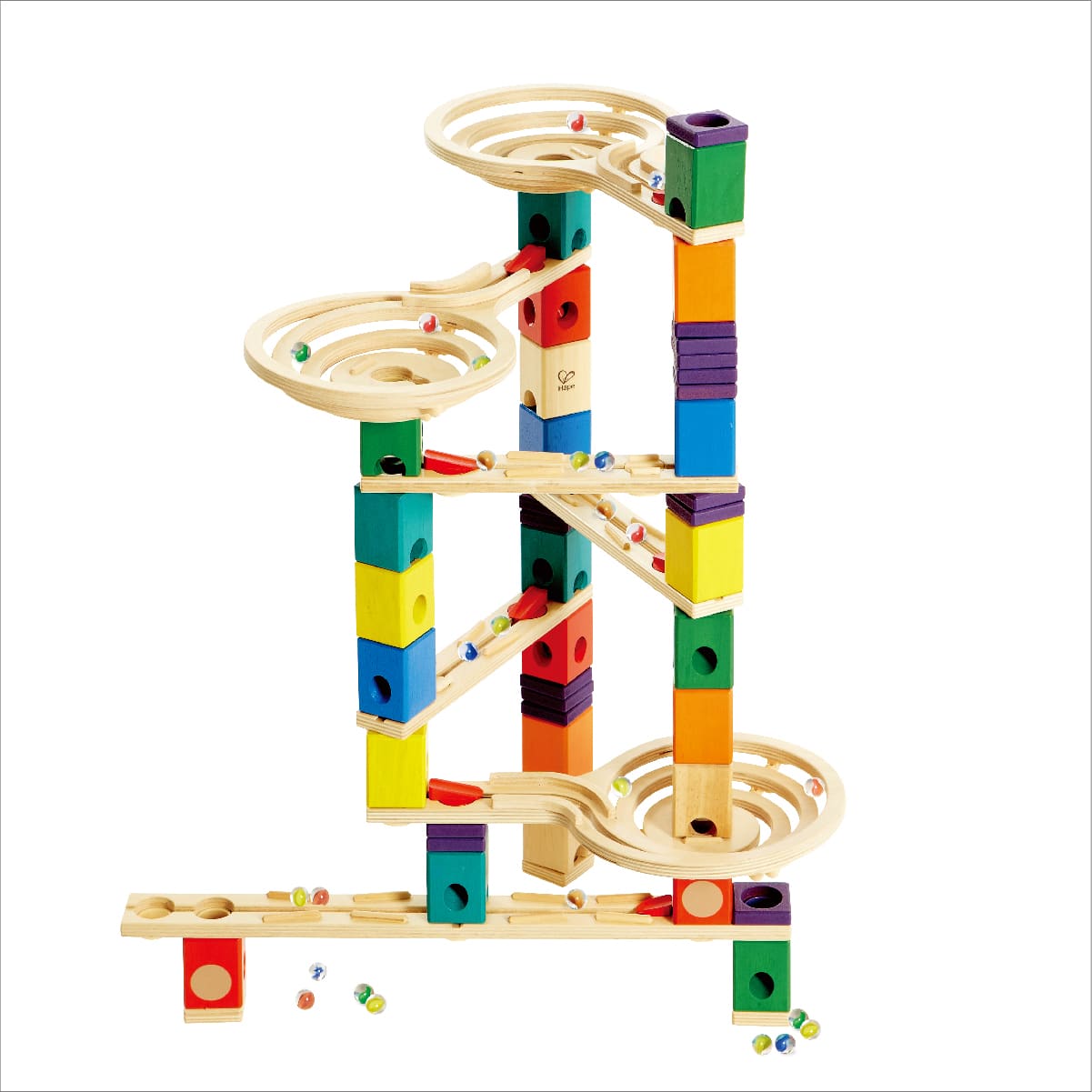 「クアドリラQuadrilla」という少し変わった名前は、クアドリラ・システムの基本構造であるドイツ語の「Quader=ブロック/直方体」と「Rille=溝」という2つの単語を合わせた造語です。ブロックとレールを下から積み上げ、ビー玉が通るコースを組み立てるあそび道具。ブロックは色によって穴の向きや数が違うので、ビー玉が通る方向もさまざま。「考える→やってみる→間違える→工夫して変えて試してみる」という試行錯誤も楽しく、挑戦心をかき立てます。その構造は、STEMの中でも注目される「コーディング」と同じような思考が必要なあそびです。