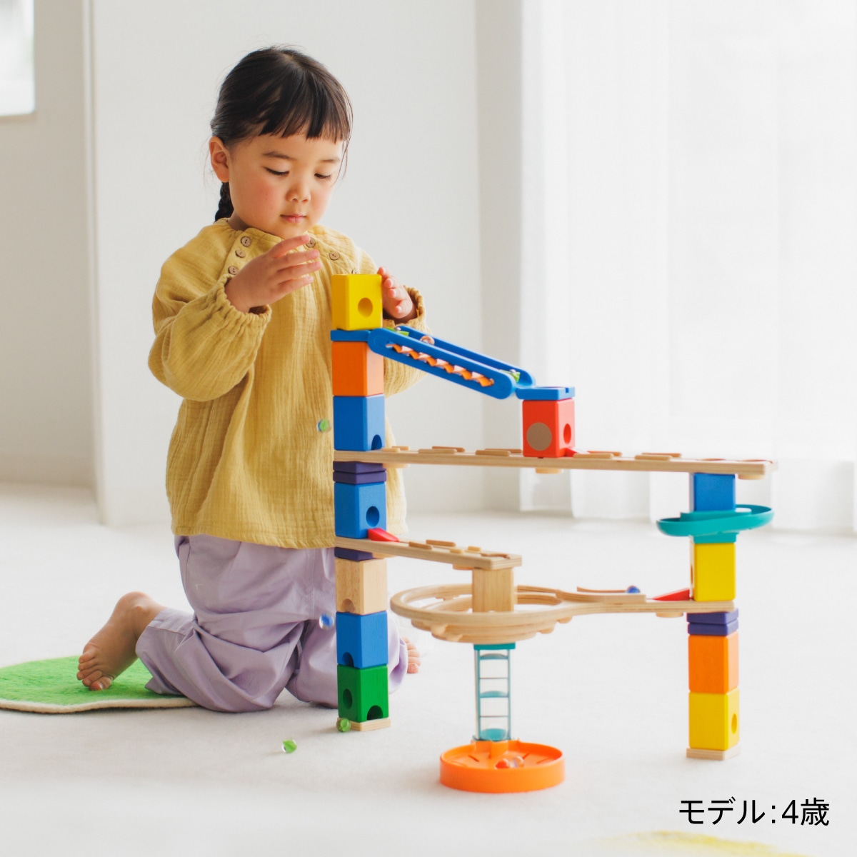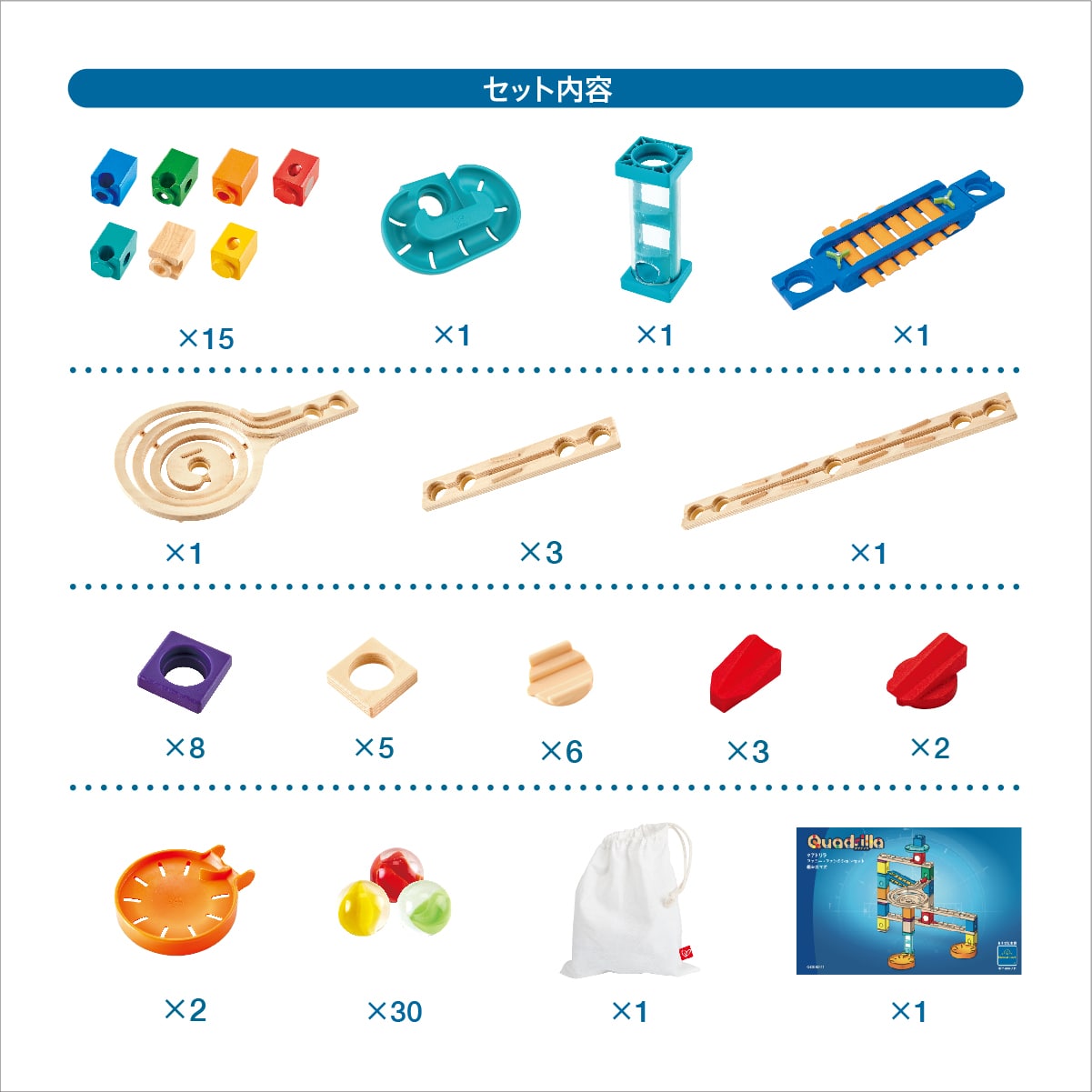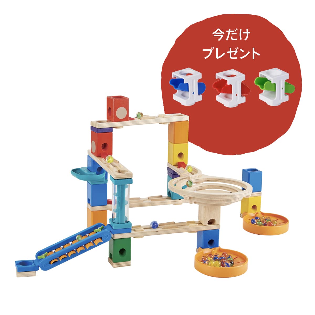 | セット内容 | ブロック(赤×2、オレンジ×2、黄×3、白木×2、緑×1、エメラルド×1、青×4)レール(ストレート大×1、ストレート中×3、うずまき中×1)メロディ・ステップ×1、ラウンド・スピナー×1、クリア・フォール×1、高さ付け(紫)×8、土台パーツ×5、加速パーツ大×2、加速パーツ小×3、穴塞ぎパーツ×6、ビー玉×30(直径16ミリ)、ビー玉キャッチャー×2、コントロールブロック×3種 |