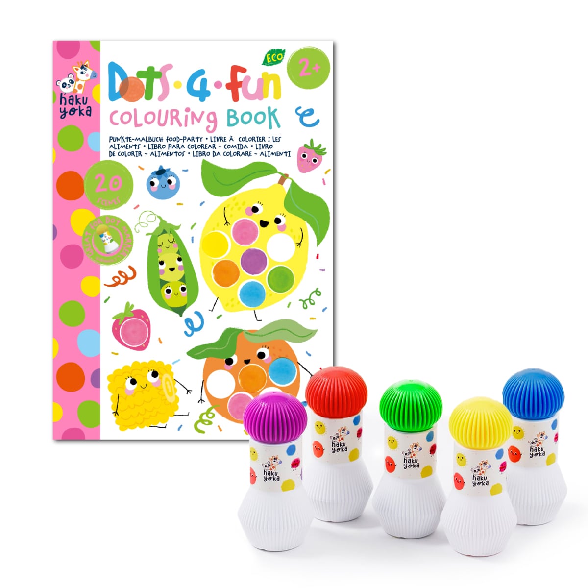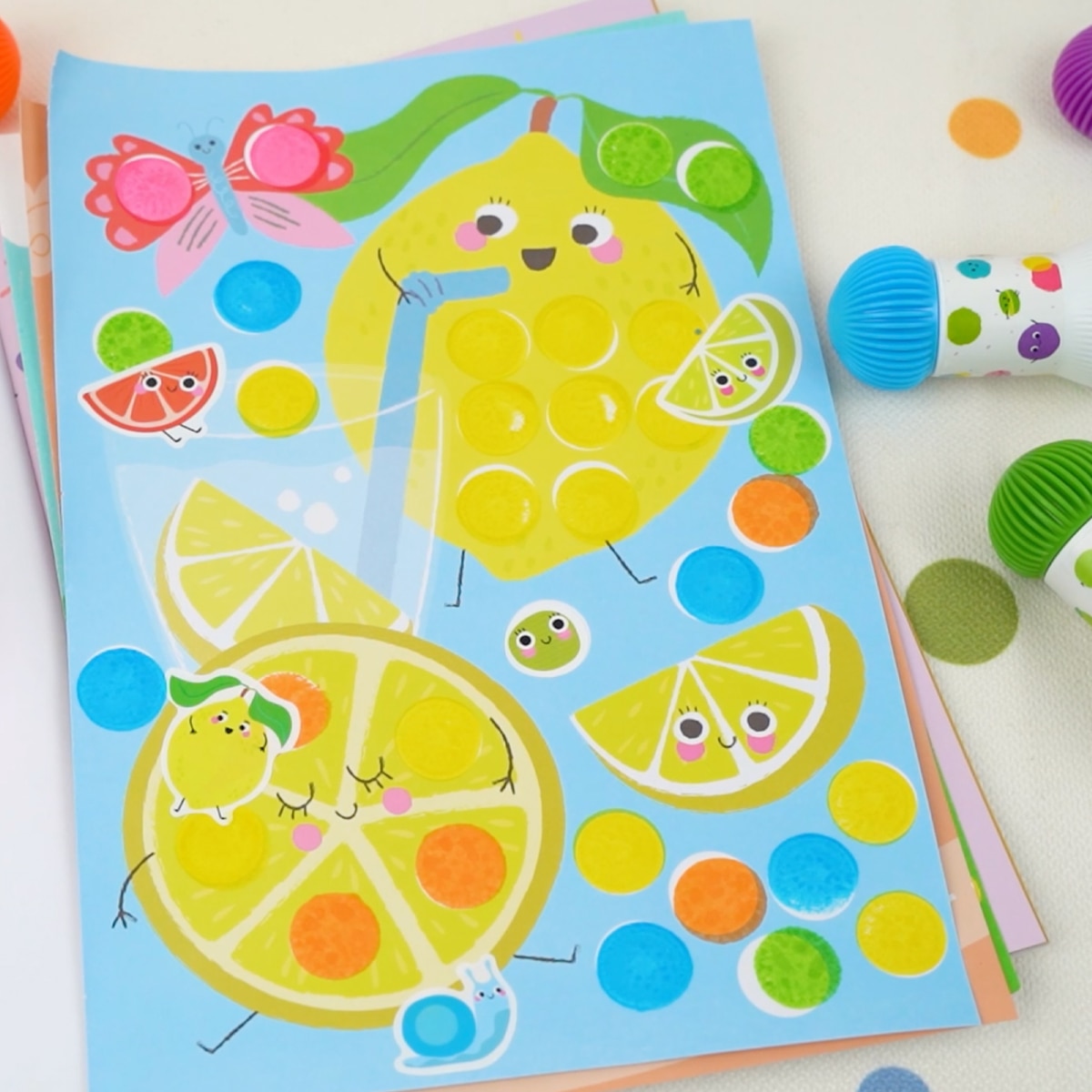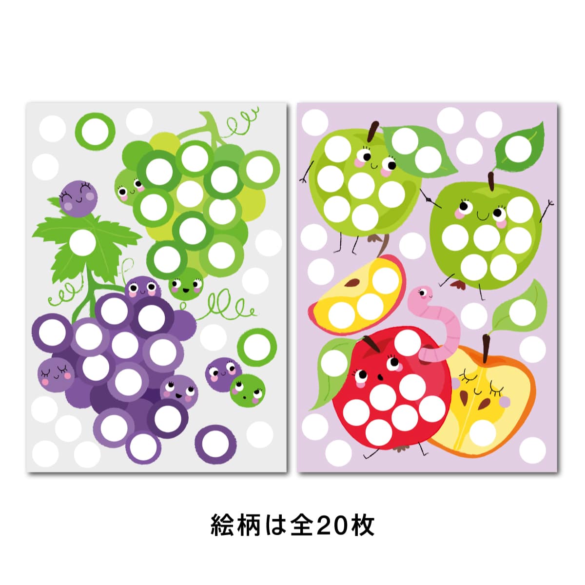 おいしそうな野菜や果物を丸いスタンプで塗っていくぬりえブック。後半のページではドットが増えたり、1ページのうちに色の持ち替えが必要になったりと、1冊の中でも小さなステップアップがあり、飽きずに続けられます。