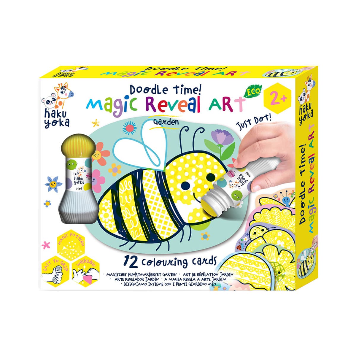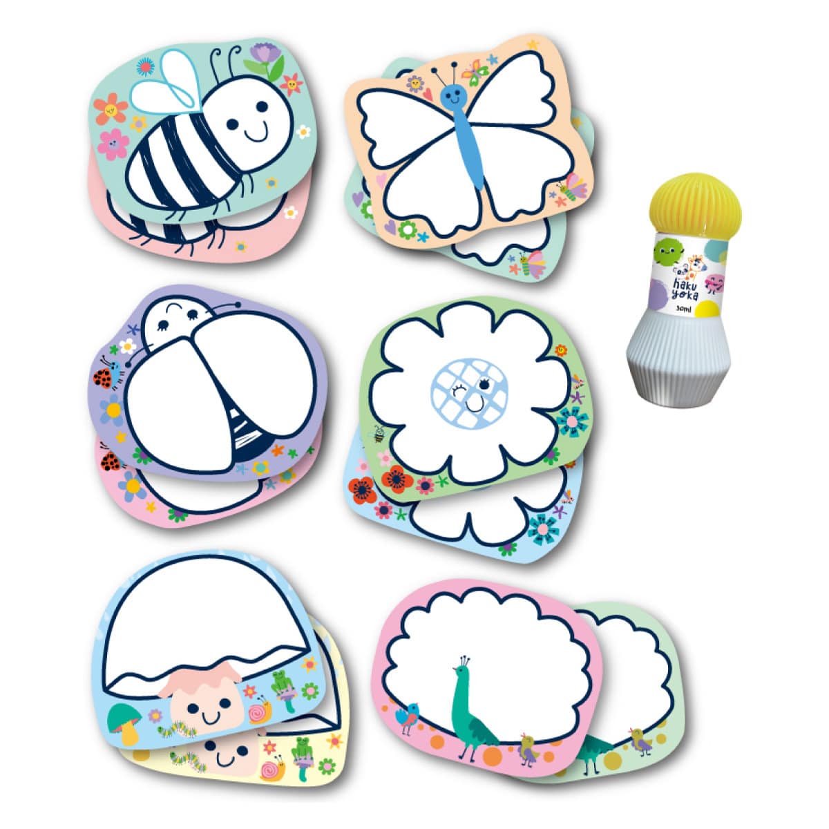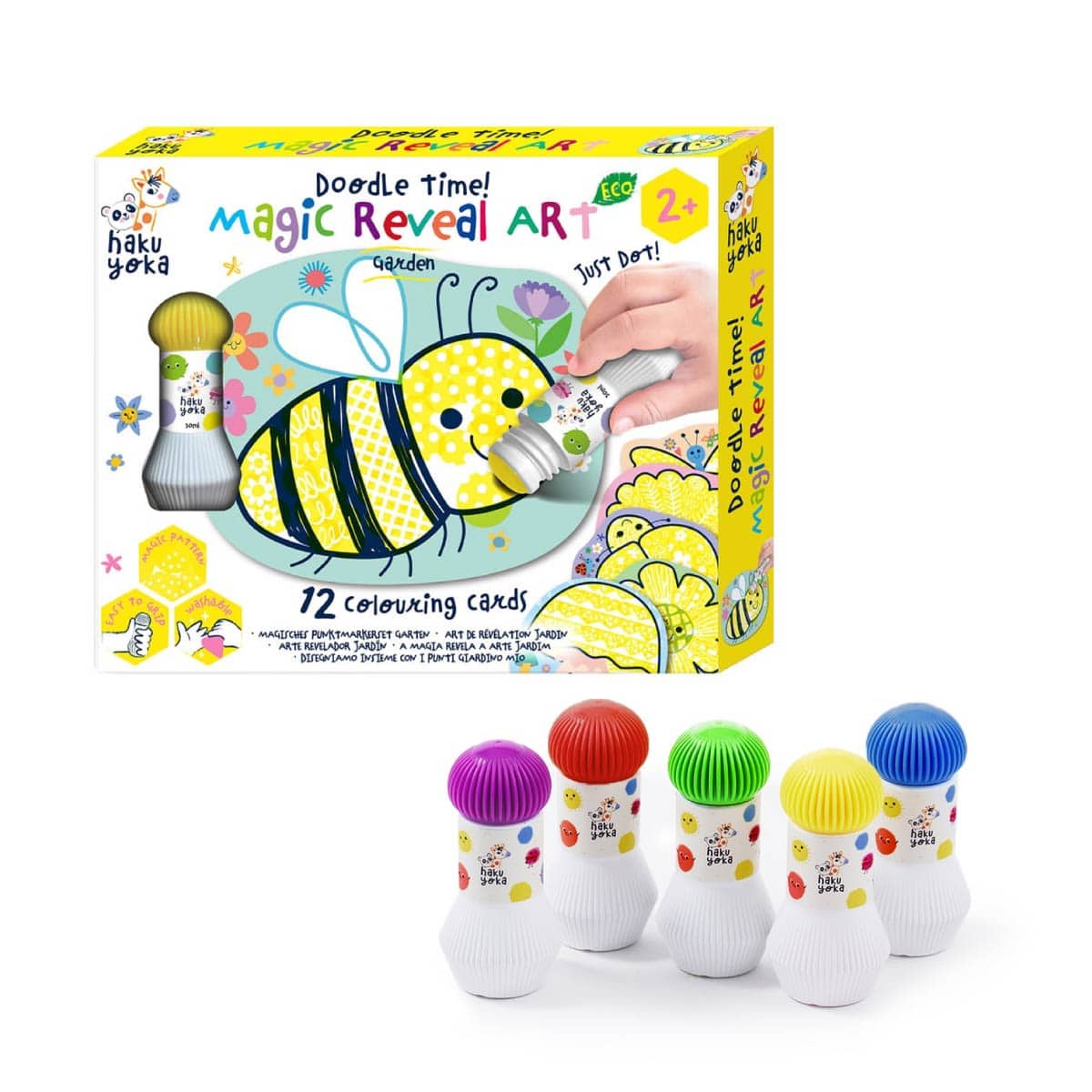 小さな手でもグーで握りやすく、スタンプのように押せる水性スタンプ・マーカー1色(黄色)と、ポンポンと押すと模様が表れる6種類のデザインシート12枚入りギフトセット。はじめてのお絵描きにおすすめです。