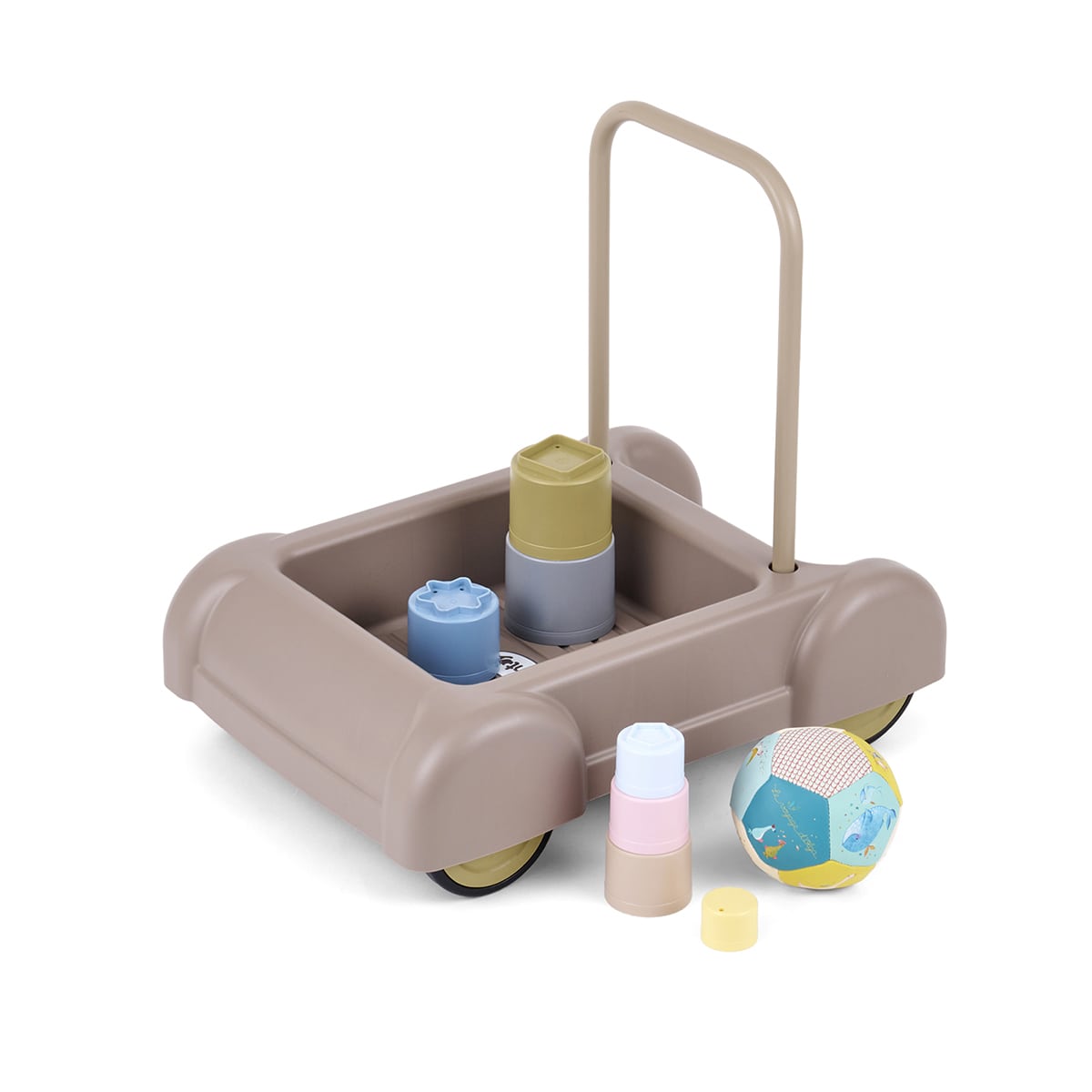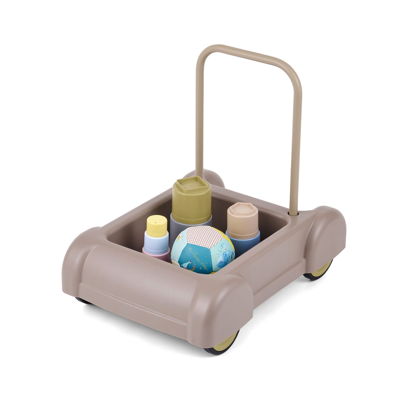 視野と興味が広がり、おうちの中でも活動範囲が広がる頃にぴったり。安定感のある大きな車輪が歩行をサポートします。安心できる支えがあることで、自然と長い時間あんよの練習が出来たり、バランスを取りながら姿勢を保ったり、方向をコントロールしたりといった、粗大運動の発達に役立ちます。お気に入りのボールやあそび道具を入れたら、お散歩気分であそべます。