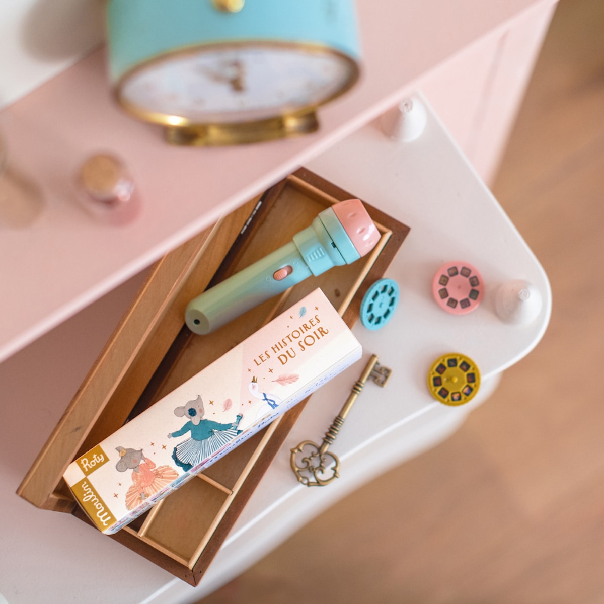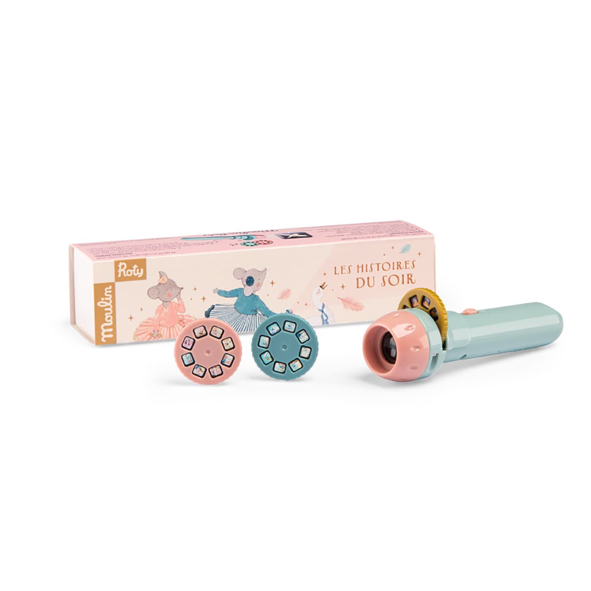 室内の明かりを消しフィルムをセットしたライトを壁・天井に向けるだけで、紙芝居のように物語を楽しめます。絵柄をヒントにお話しを考えて、寝る前の親子タイムにぴったりです。3つのおはなしディスク入り。