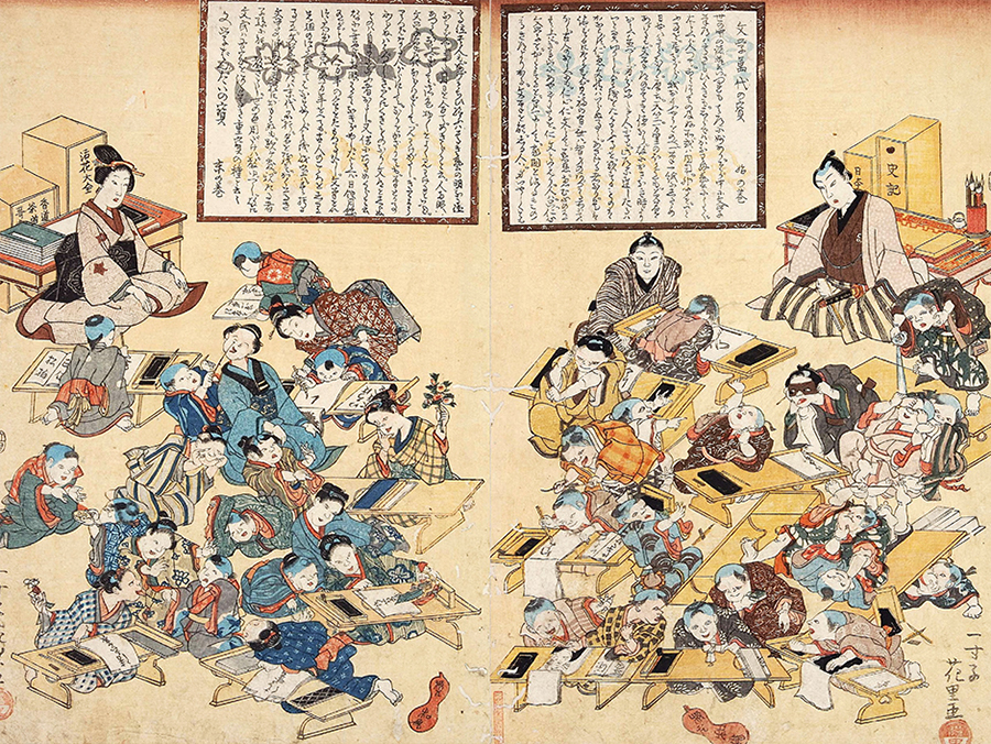 浮世絵に描かれた寺子屋の様子。子どもたちは思い思いの姿勢や方法で学び、大人は少し離れたところから見守っている