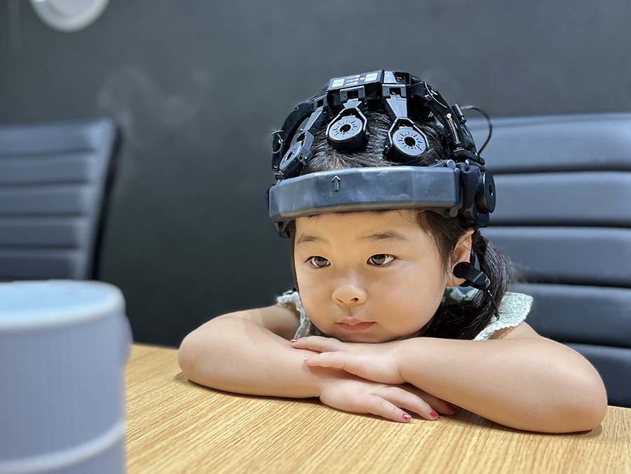 ただいま定量脳波解析中。電極がついたヘッドギアを装着して、脳波を記録します。