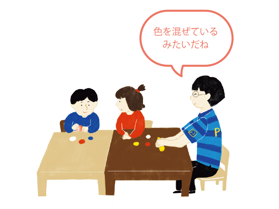 2歳頃の子どもだと、同じことをしていても一緒に遊んでいるわけではないという「並行あそび」状態のことも多いですが、もしお互いを気にしている様子があれば、相手のことを言葉にして声がけしています。例えばネンド遊びなら「違う色を混ぜてるね」「新しい道具を使っているね」、ボール遊びなら先に遊んでいた子にもちゃんと分かるように「いま真似して投げてるよ」「一緒にがんばってるね」と後から加わろうとしている子のことを伝えています。一緒に遊ぶか遊ばないかは、子どもが選ぶことなので、「一緒に遊んであげてね」と頼むようなことはしません。