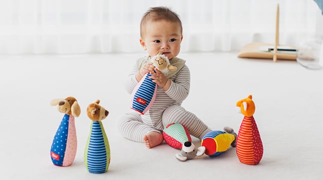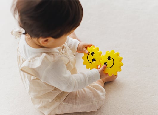 赤ちゃんの微細運動(指先や手を使った細かい動き)は、手と目の協応動作や脳の発達を促します。また、はじめてのできた!を重ねることで満足感から、シンプルな動作のくり返しに夢中になります。「また遊びたい」という意欲が、さらなる好奇心につながっていきます。成長に合ったあそび道具を選び、あそびを通じてたくさんの動きを引き出しましょう。
