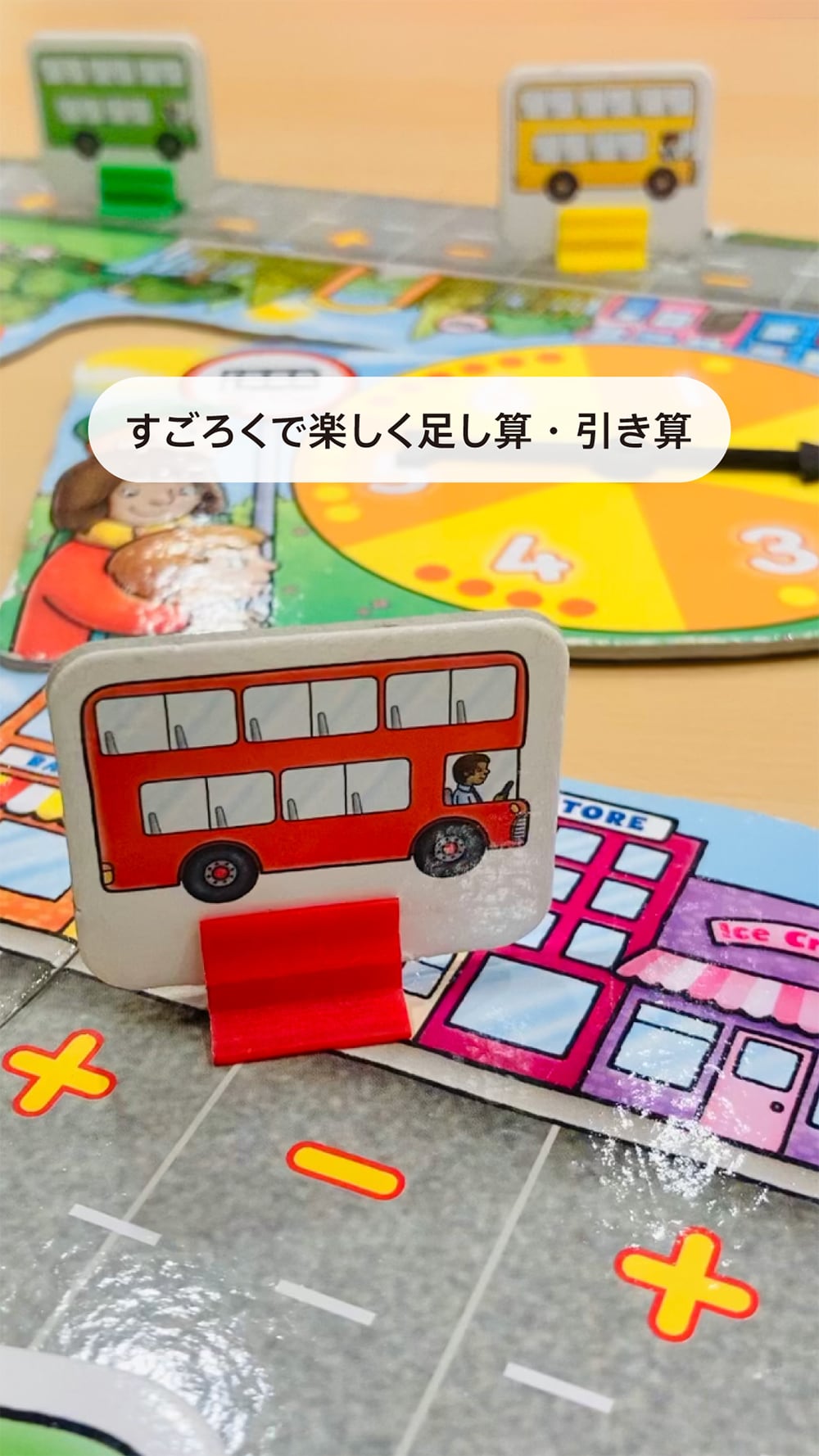 「+」のマスでは人を乗せて、「−」のマスでは人を降ろす…をくり返して進むスゴロクです。数が増えたり減ったりを、あそびながら自然に体験できます。ルールがわかりはじめる4歳頃からおすすめ!