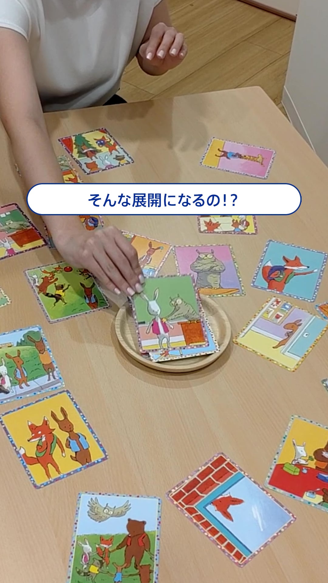 絵が描かれたカードを伏せて山にし、順番に1枚ずつ引いていきます。前の人が出したカードの内容に続くように、自分のカードを使ってお話を考えましょう。セリフや展開はぜんぶ自由!思いつくままに物語を作っていきます。