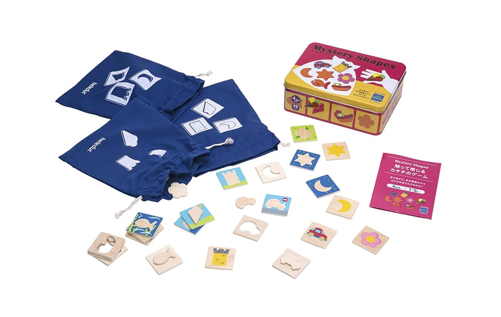 袋の中に入ったピースを、手の感触だけで当ててみよう!「シルエット」「型抜き」「くっついた形」など、同じシルエットでも凹凸の表現がちょっとずつ違うのがポイント。目で見ずに、手の感覚を頼りに、何の形か想像してみよう。