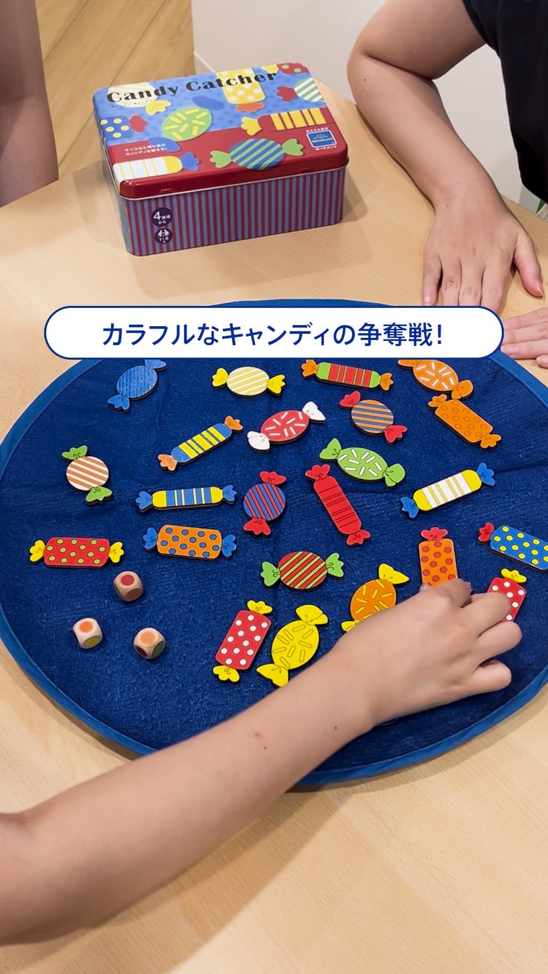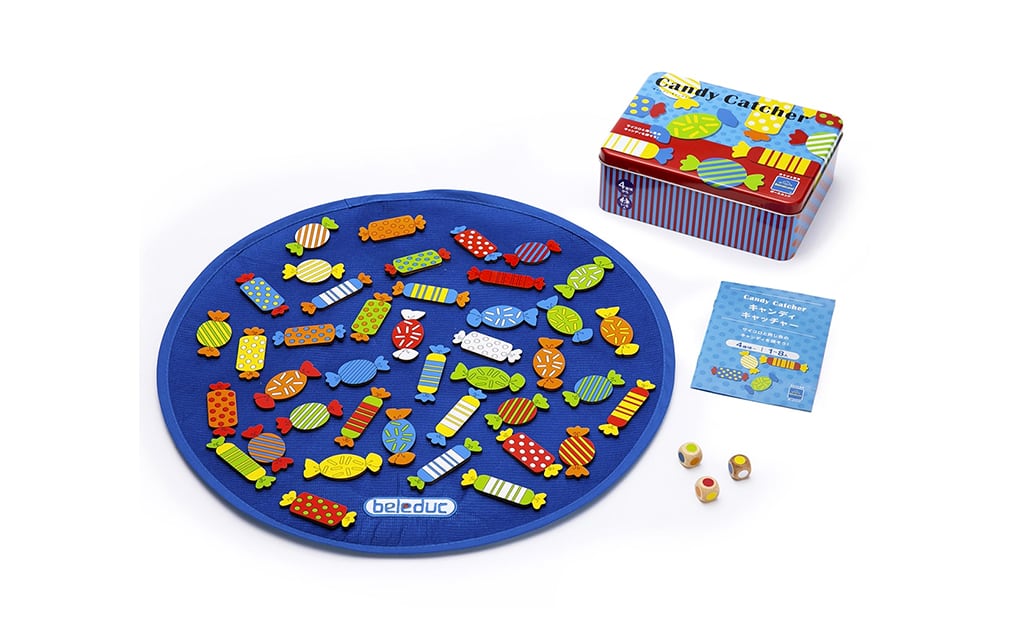 サイコロを3つ振って、出た色と同じキャンディーを探します。41個のキャンディーは、すべて色の組み合わせが違うから、色をしっかり見分けながら素早くゲット!キャンディーの色をつなげるドミノや分類あそびも楽しめます。