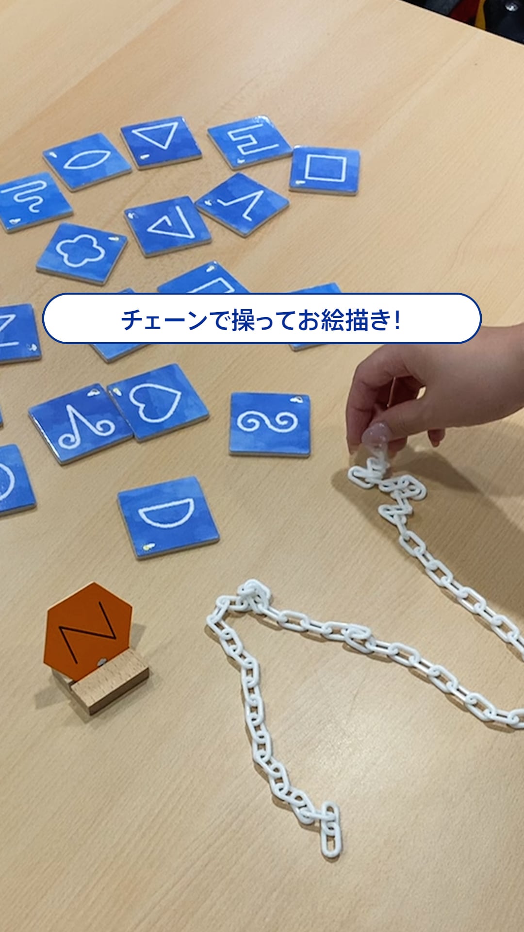 カードに描かれた幾何学模様を、チェーンを使って再現しよう!出題者はカードを見ながら、特徴をうまくとらえてチェーンで形をつくります。回答者は、それをよく観察して、どのカードと同じかを当てます。