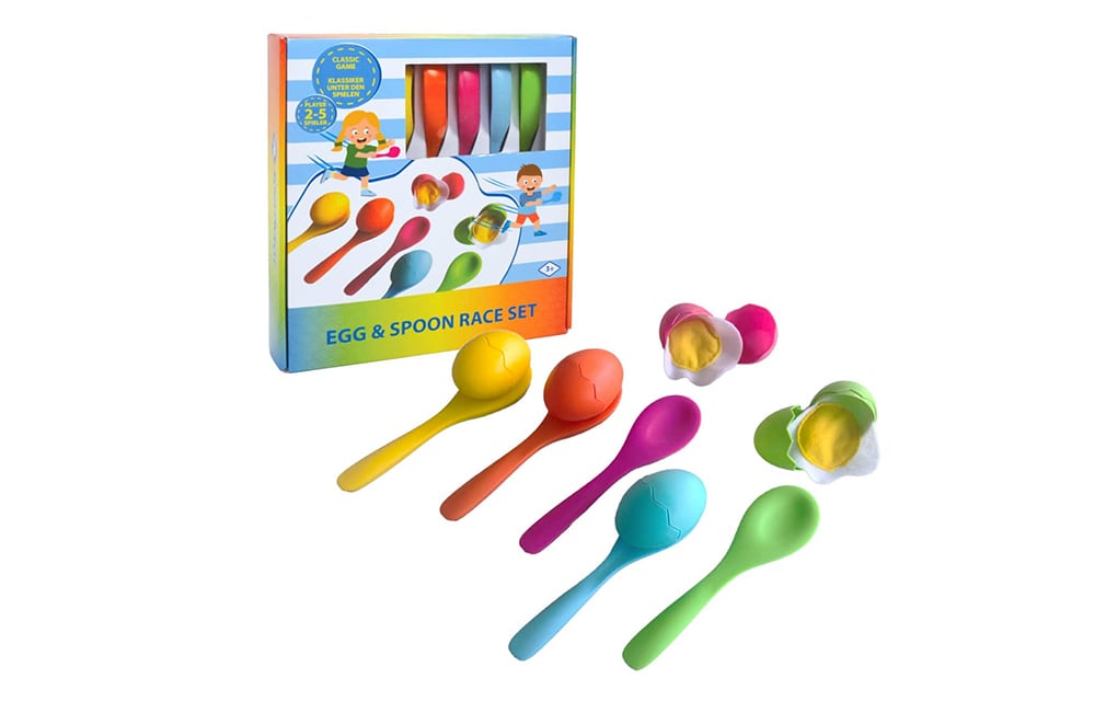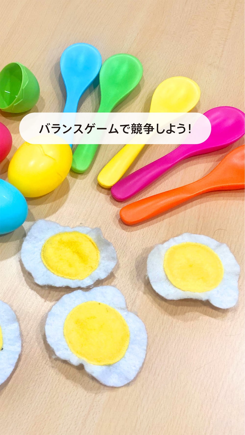 スプーンに卵を乗せて、よーいドン!走らずに早歩きでゴールを目指したり、その場で片足立ちして何秒キープできるかを競ったり、いろんなあそび方で楽しめます。バランスがくずれると、卵がパカッと…!?