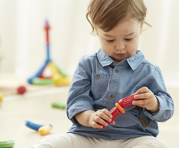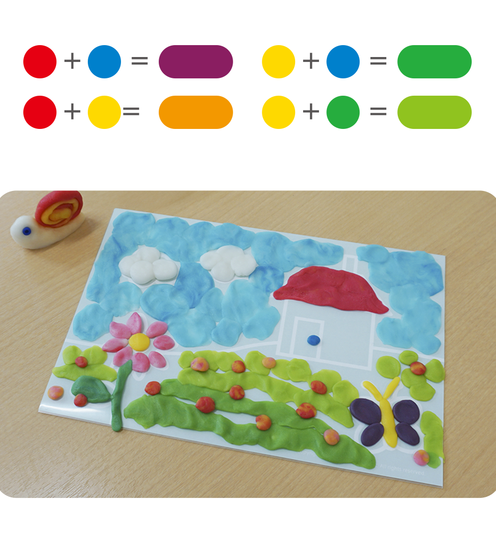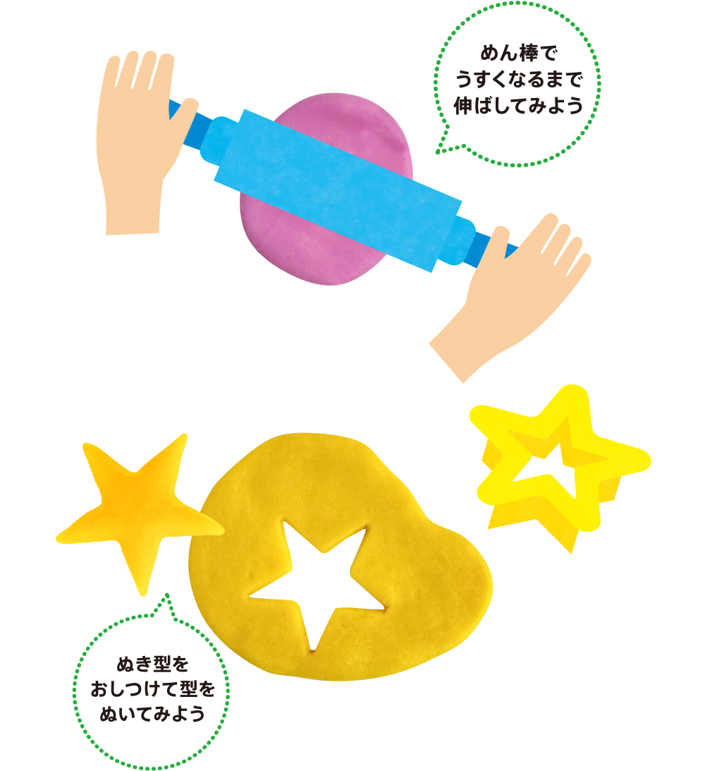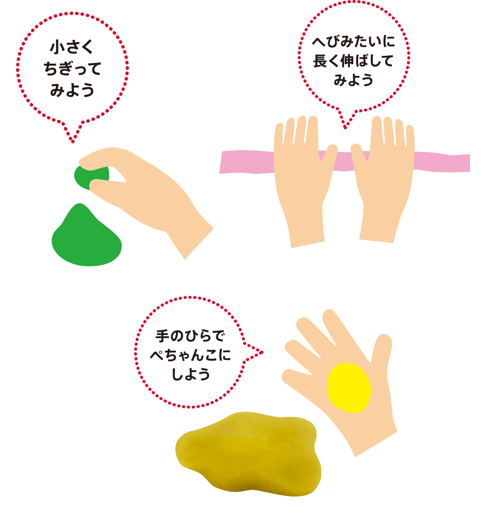 はじめは好きな色を1〜2色選んでみましょう。感触を楽しみながら、こねて、こねて。色や形から連想するのも得意になってきたら、できた形を何かに見立ててみましょう。