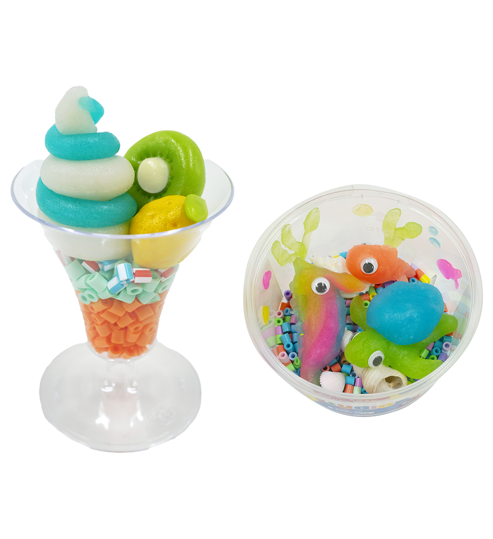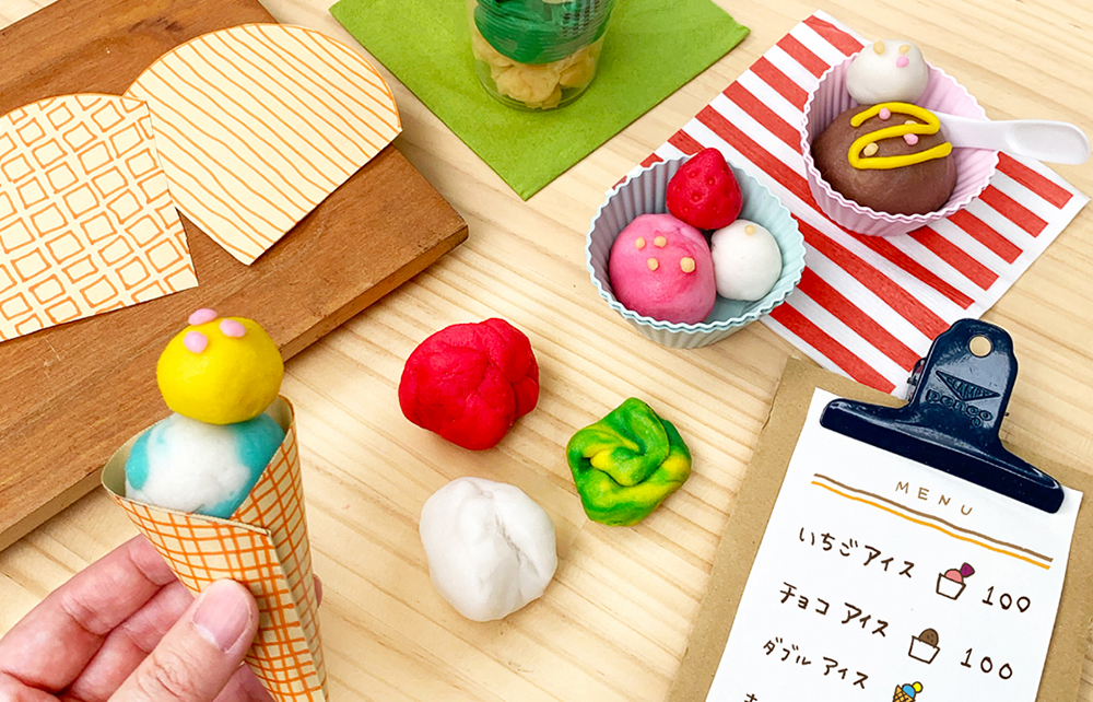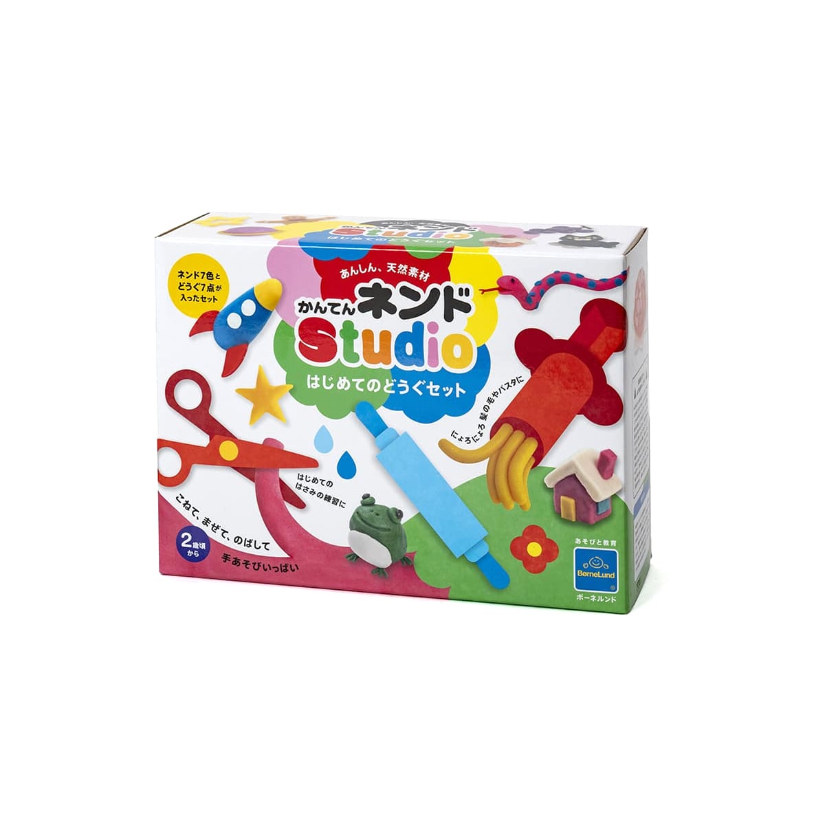 かんてんネンドStudioは、「寒天」を原料にしたねんどです。手の温度でやわらかくなり、感触あそびや自分の手で何かを生み出すことが楽しくなる頃にぴったりです。防腐剤や防カビ剤を一切使用せず、天然素材からできているので、はじめてねんど遊びをするお子さまも安心して楽しめます。