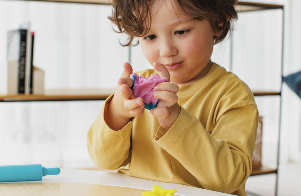 ねんど遊びは完成形にとらわれず、「自分でできた!」という満足感を得やすいあそびです。自分でやってみたい気持ちが芽生える2歳頃にぴったり。かんてんネンドは、こねるほどやわらかくなる感触そのものが楽しく、うまく形にならなくても夢中で遊べます。 言葉や身体の発達が進む一方で、細かな手先の動きや言葉の使い方はまだ発展途上の時期。ねんど遊びは「こねる」「ちぎる」「丸める」「のばす」といった多様な動きを通じて、力加減や手先の器用さを育みます。