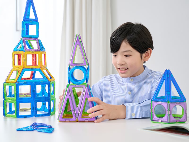 子どもが同じ形だけをつなげようとするのは、形を見分ける力がある証拠。同系色でつなげるのも数学的思考と造形力を育みます。手を使って遊ぶうちに、形が違う三角と四角をうまくつなげるにはどうすればいいかを考え始め、角度を変えたり、立体をつくれたり、さまざまな新発見に出合います。3歳から遊ぶことをおすすめしているのは、このステップをスムーズに進められる年齢だから。2つの形を使いこなして立体づくりに目覚めると、次は形のバリエーションが欲しくなるでしょう。