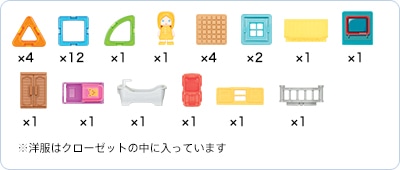 窓や家具、人形パーツ入りで、自由にお部屋をつくって遊ぶことができるセット。