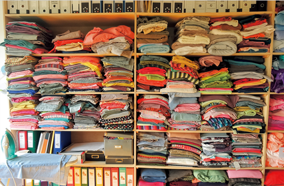 フランス製生地にこだわり、毎年生地見本市を視察、独自のインスピレーションで生地を買いつける。