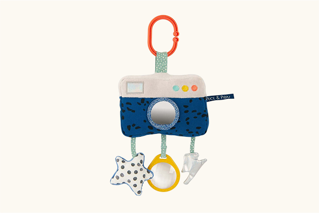 カメラ型の手遊びトイ。割れないミラーや音が鳴る星、キラキラ揺れるプリズム、パリパリ音のフラッシュなど仕掛けがいっぱい。ベビーカーやママバッグに取り付けて、お出かけ先でも赤ちゃんがご機嫌に過ごせます。