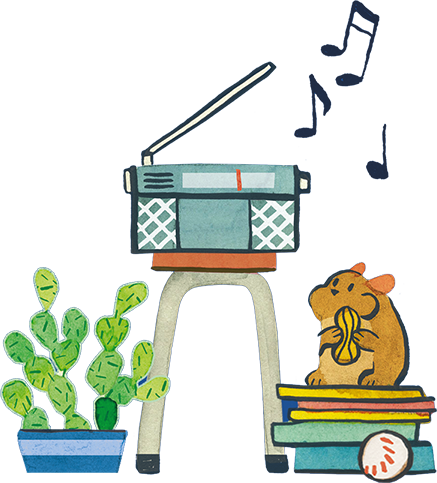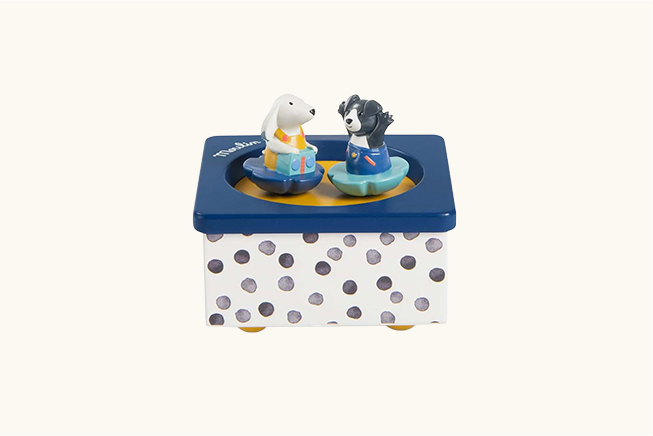 オルゴールのネジを巻くと、ピュスとピルーがくるくると回り出します。ピルーがラジカセを手に持っていて、まるで2人でダンスパーティーを楽しんでいるよう。踊る姿と流れる音楽が、見ている人を癒します。