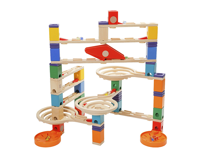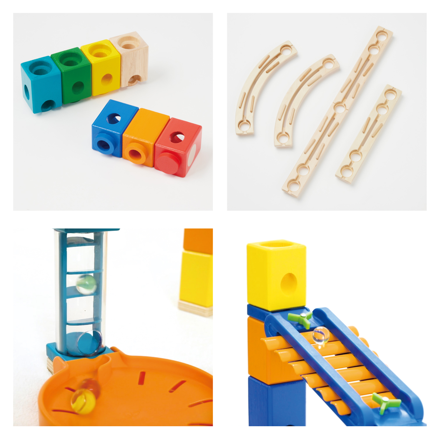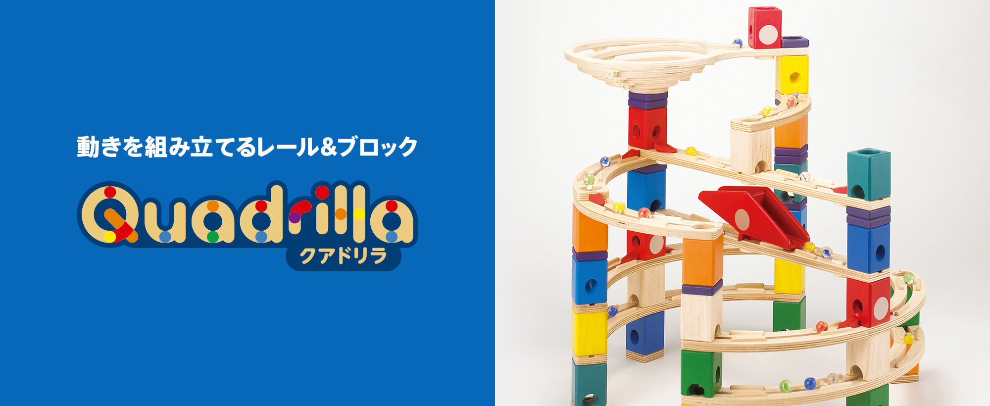 色によって穴の位置が違うブロックと、レールを積み上げて、ビー玉の「動き」をデザインするクアドリラ。あそびの中でトライ&リトライをくり返し、試行錯誤する面白さが4歳頃からの挑戦心をかき立てます。