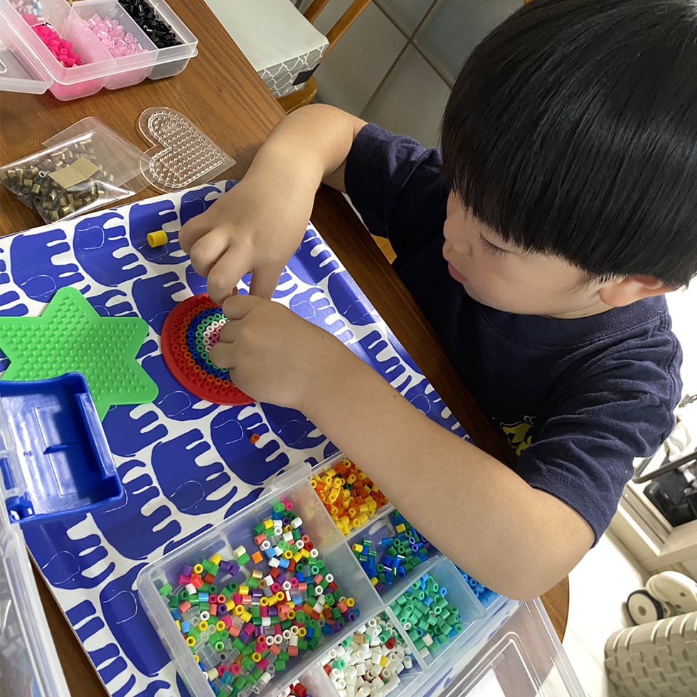 「娘から“1日30分くらいは知育の時間を作ってほしい”とリクエストされていて、指先を使うあそびや、英語の音楽を取り入れるようにしています。ハマビーズは孫のお気に入り。専用コーナーをつくって、色分けしたビーズをセットしておくと、いつでも好きな時に取りかかれるんです。児童館の棚づくりを参考にして、パズルもジップロックで整理しておくなど、小さな工夫を積み重ねています」