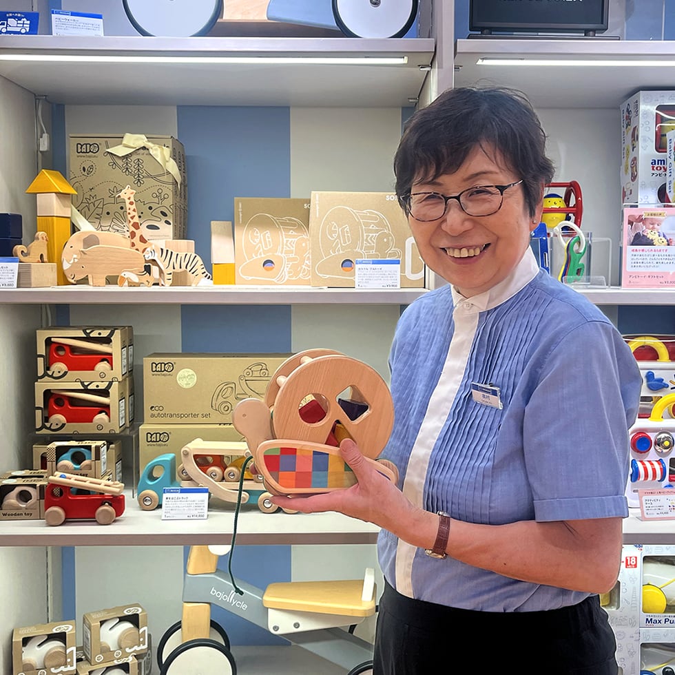 原宿本店を拠点に、たくさんの親子のあそび道具選びと子育てに寄りそってきた、インストラクターの奥村さん。私たちスタッフにとっても、接客やあそび道具の知識、そしてお客様との向き合い方まで、多くを学ばせていただく“THEカリスマ”。