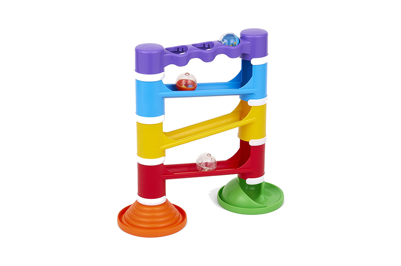ボールをポンッと叩くだけで楽しめるボール転がし。音が異なる3種のボールや、道筋がしっかり見えるレールなど、繰り返しあそびが楽しくなる頃に最適な工夫が満ちています。レールの途中から始めれば、「握って、はなす」動作の練習にも。レールは入れ替えや取り外しができ、コースを変えて楽しめます。
