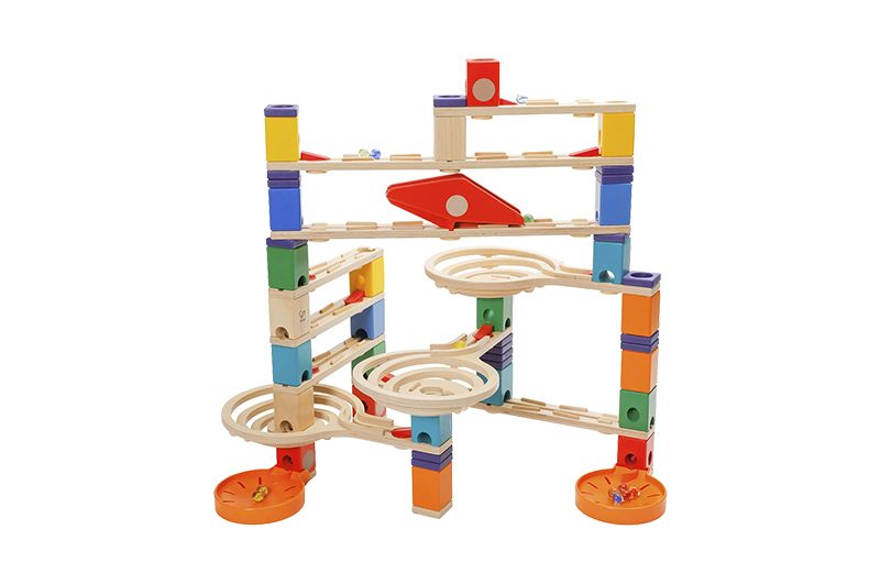 「クアドリラ・ツイスト&レールセット」は、赤いブロックを組み替えて左右交互にビー玉が転がるコースを何通りも作れます。さらに、シーソーパーツを使ってビー玉をダイナミックに動かすことも可能です。