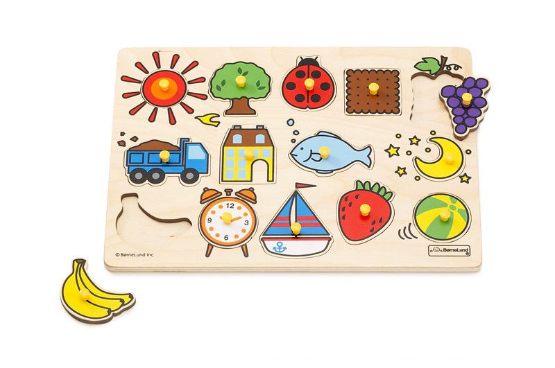 14種類の身近なモチーフのパズルです。パズル遊びから、物の名前などを声に出してお話の練習もできます。丸い形は「おひさま」「とけい」「ボール」に使われていますが、それぞれ大きさは異なり、正しい位置におかないときちんとはまらないようになっています。