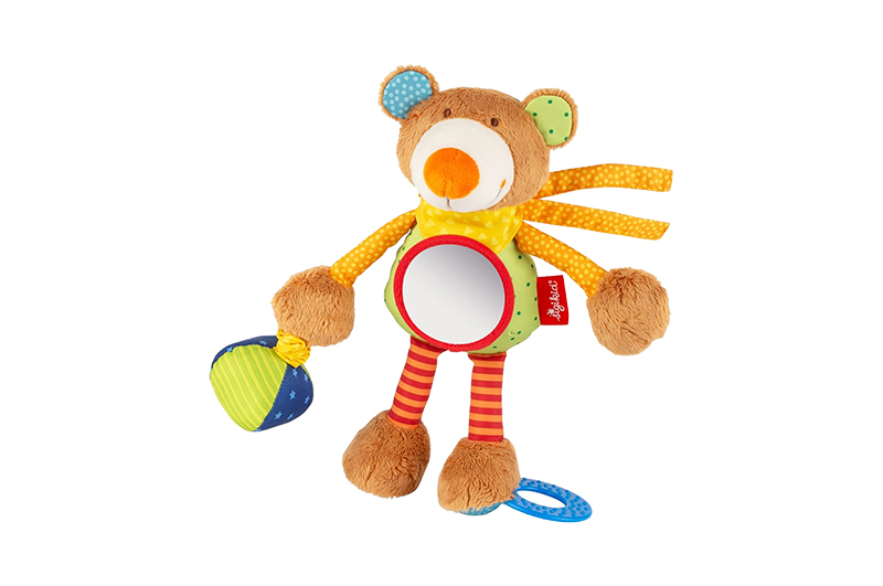 1歳くらいまで月齢に応じて遊べる、ふわっとしたやわらかい手触りの布製ぬいぐるみ。全体に遊びの仕掛けが施されていて、鈴の音や歯固め、鏡などで感覚を刺激します。赤ちゃんとの添い寝はもちろん、ベビーカーの安全ベルトに結びつけることができるので、屋内外あらゆるシーンで赤ちゃんに寄り添ってくれます。