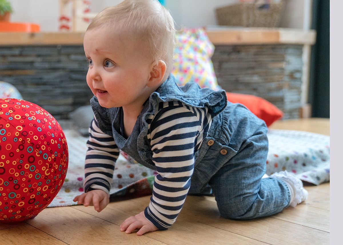ハイハイを活発にさせてあげると、手足の力や平衡感覚が育っていきます。これはやがて立ち上がって歩くためにとても大切なことです。赤ちゃんは動くものに興味津々。目の前でボールを転がしたり、プルトーイを動かしてあげると、赤ちゃんは手を出したり追いかけたりしたくなります。